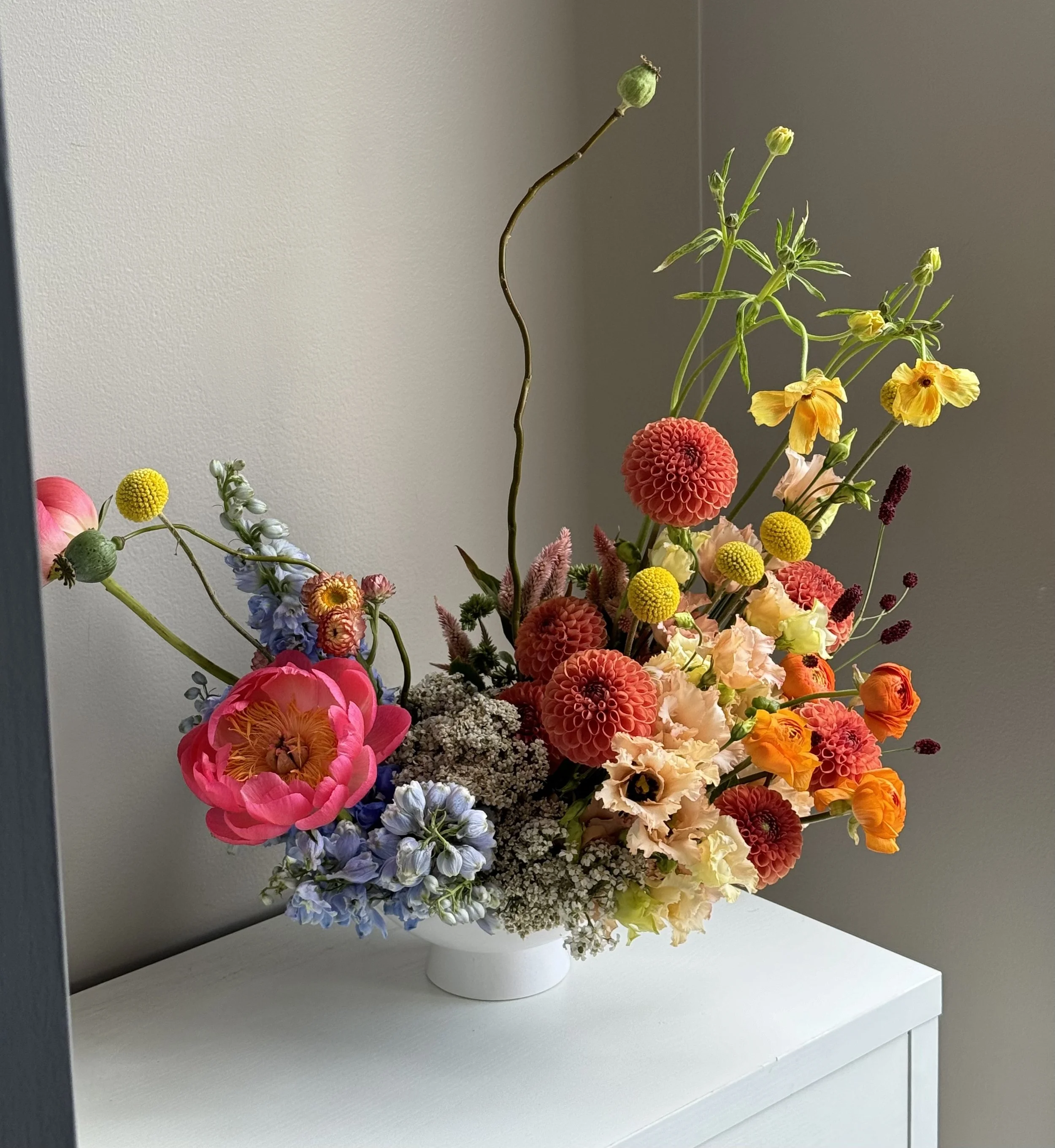 Each arrangement is a floral composition - seasonal, intentional, and artfully built with form, movement, and texture in mind. We do not offer standardized bouquets or mass-produced designs. Each piece is custom-made using the best of what’s in season, designed to reflect and honor the feeling or story behind your gesture. Images are representative for the overall design. Actual vessels may vary based on availability.
