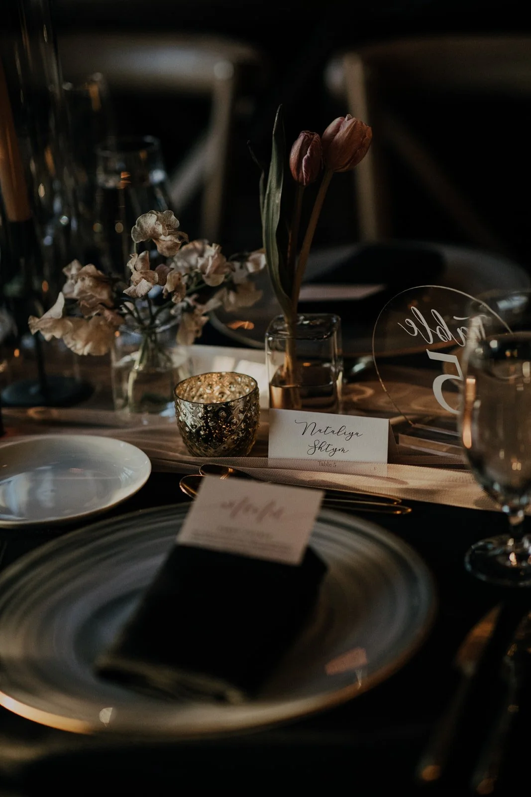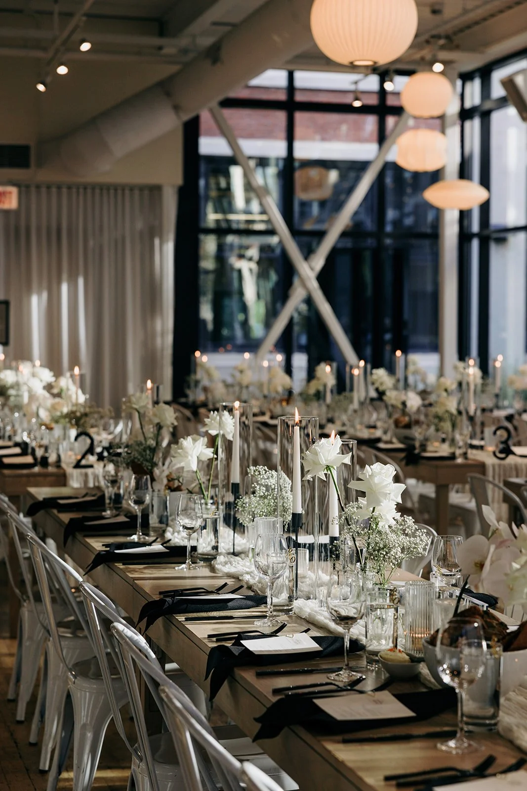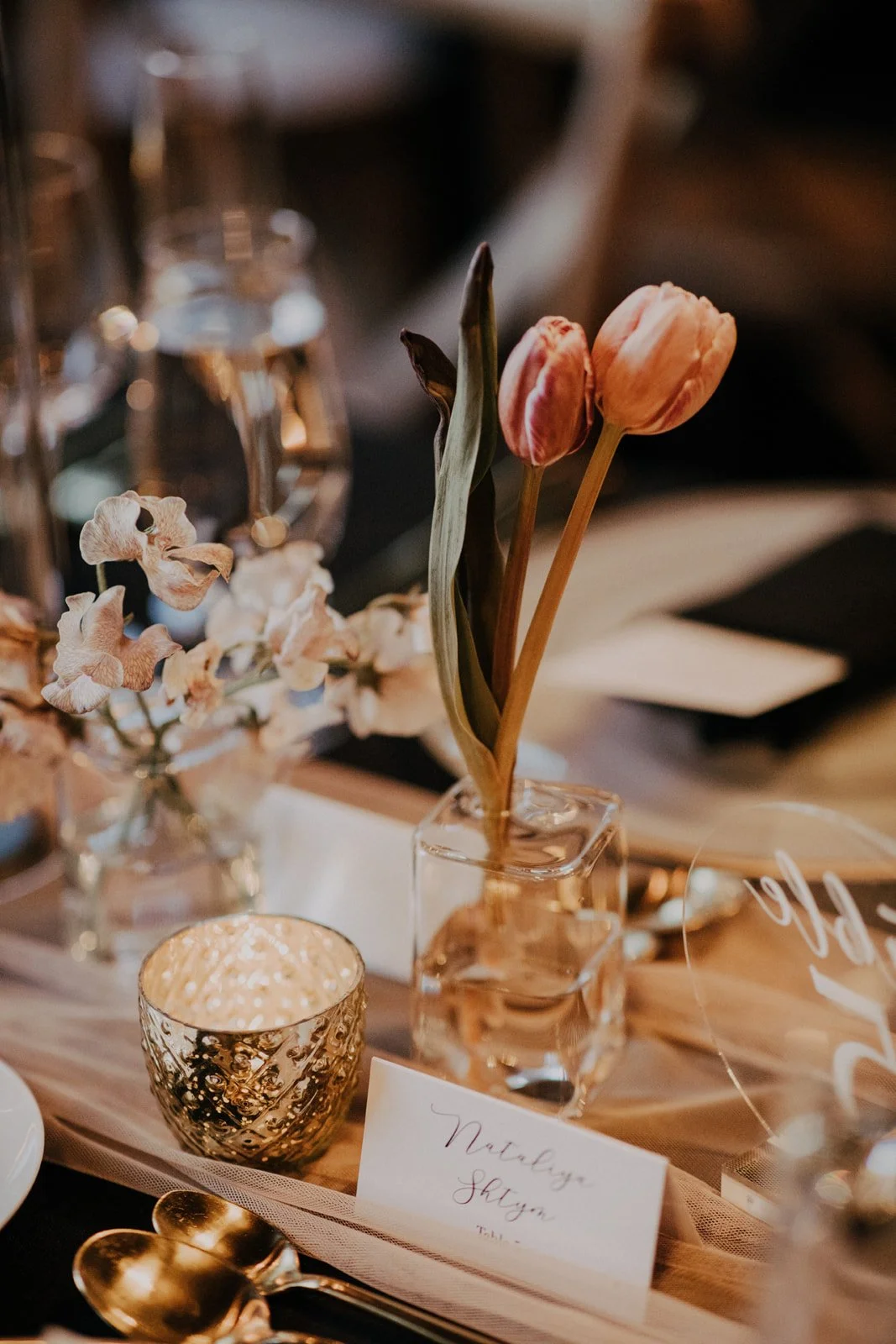 Elegant dining table set for a celebration with floral centerpieces, gold and clear glassware, candles, and tableware, in a bright room with brick and white-washed walls.