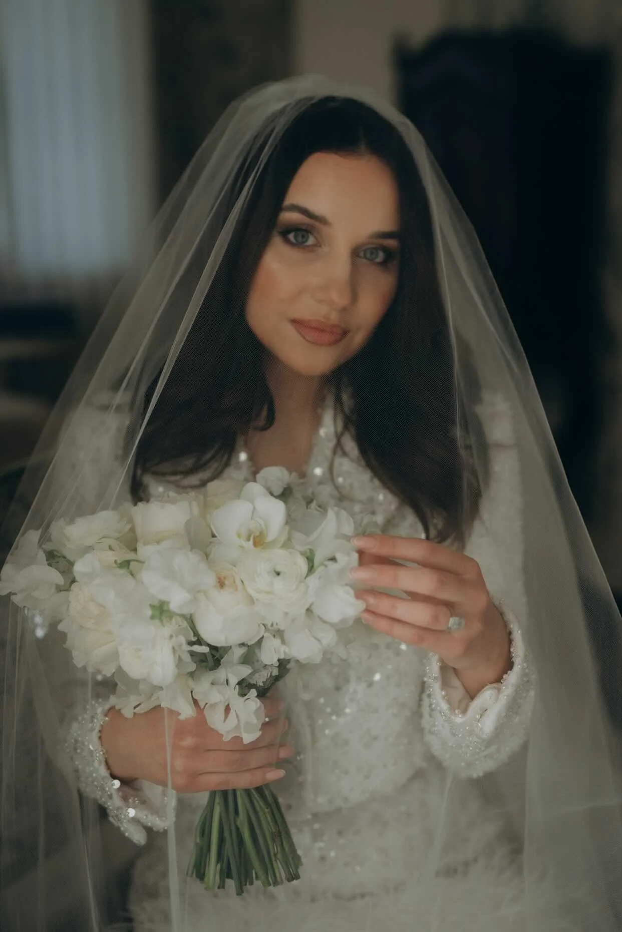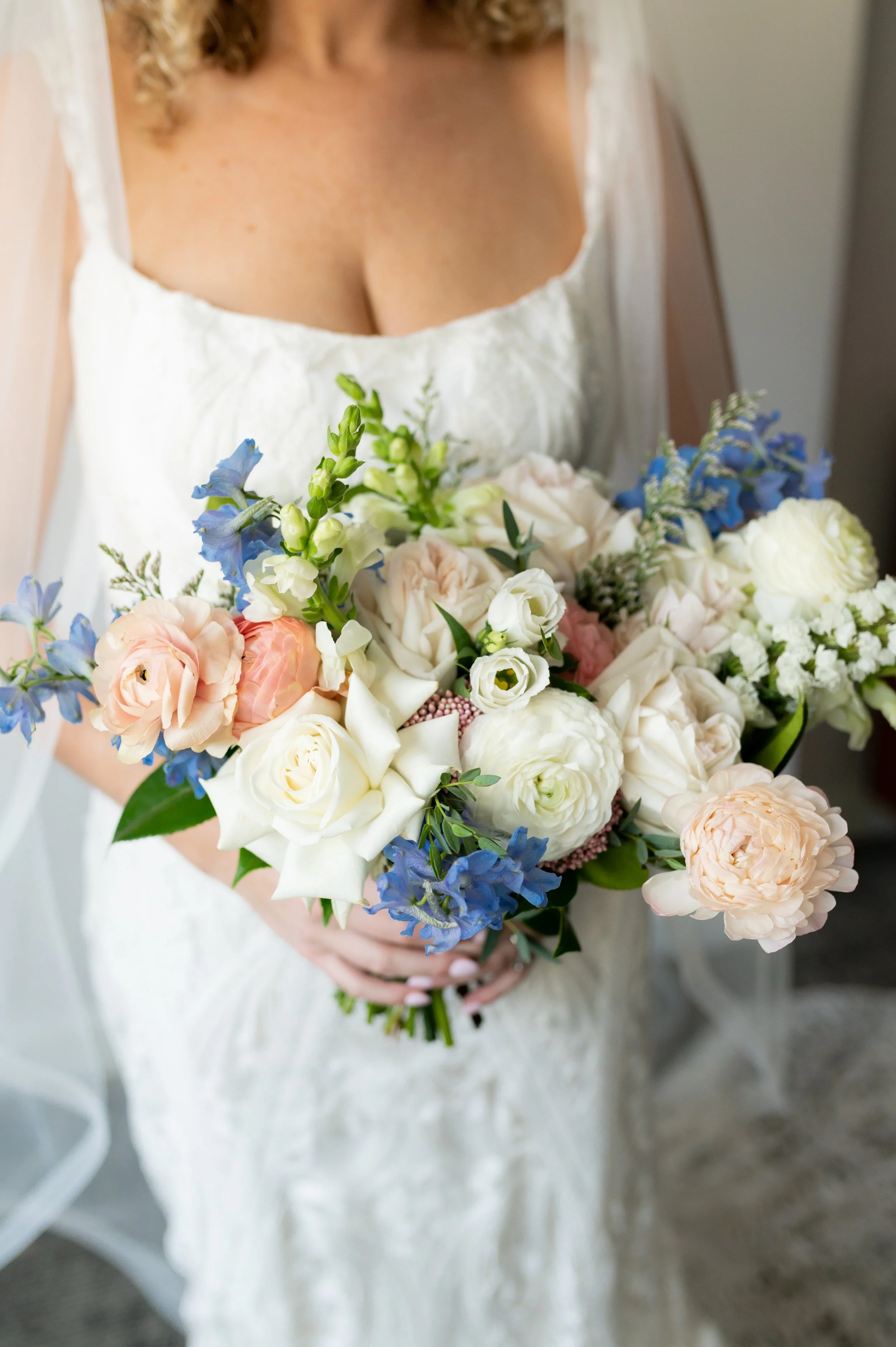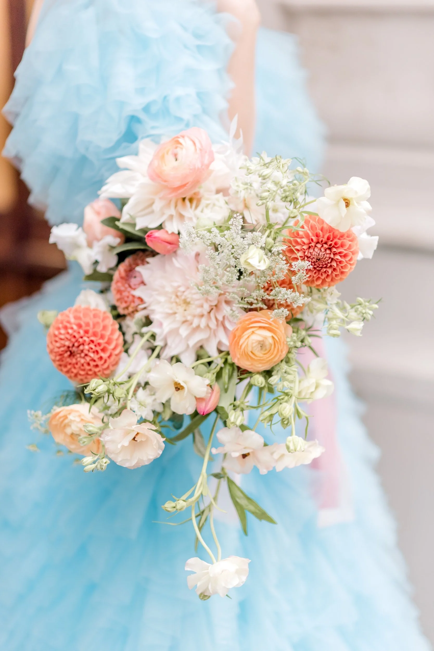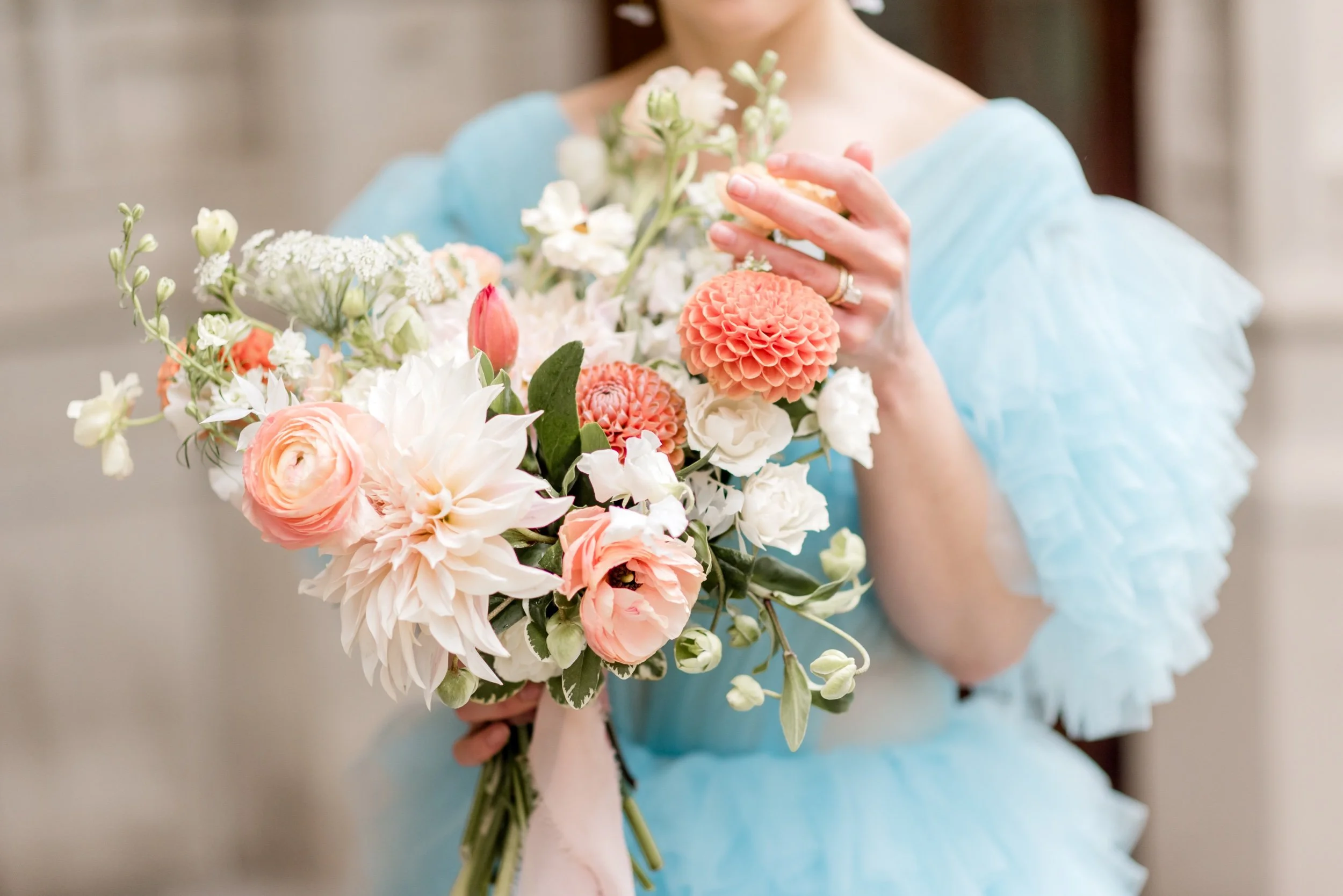 A person holding a large bouquet of light pink, white, and peach flowers, partly obscured by a light blue dress and a veil.