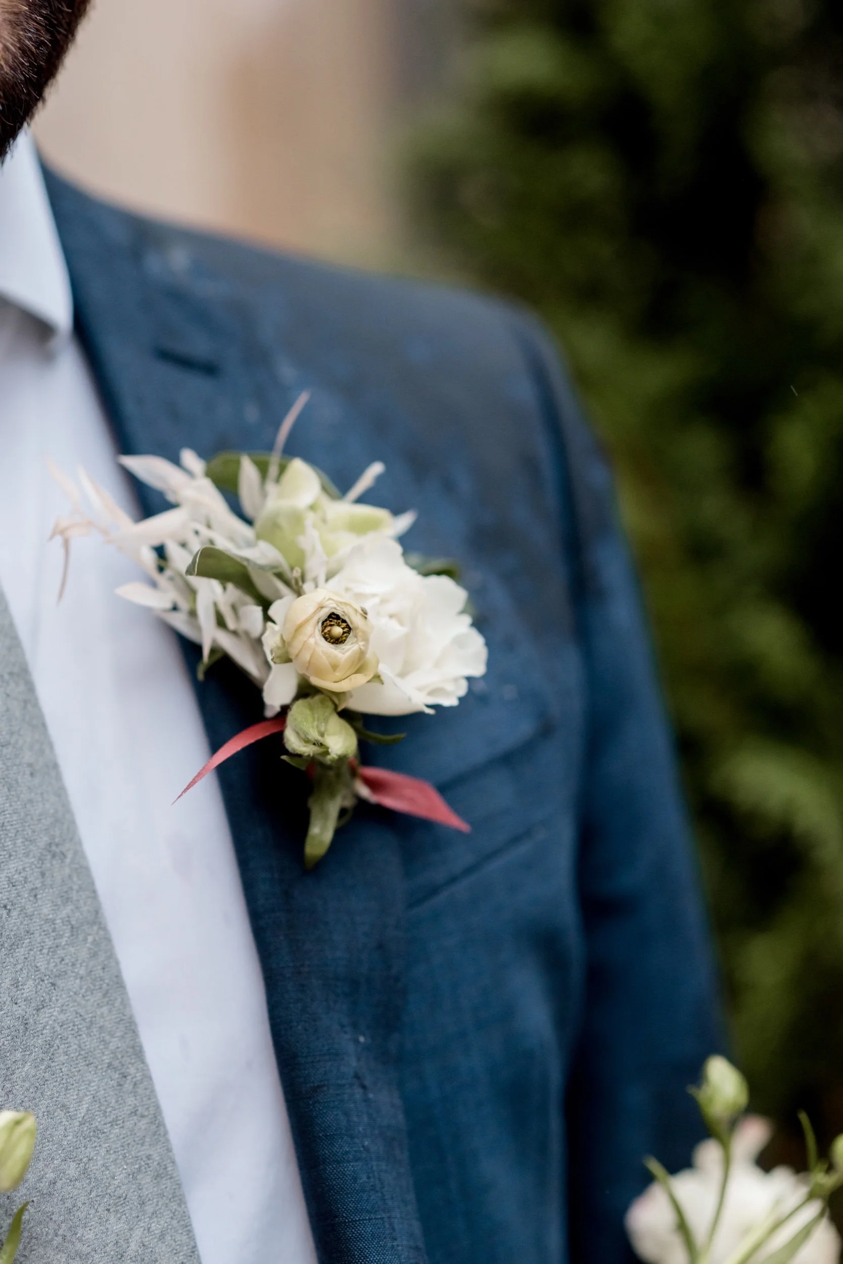 Close-up of a boutonniere with white flowers pinned to a blue suit jacket.