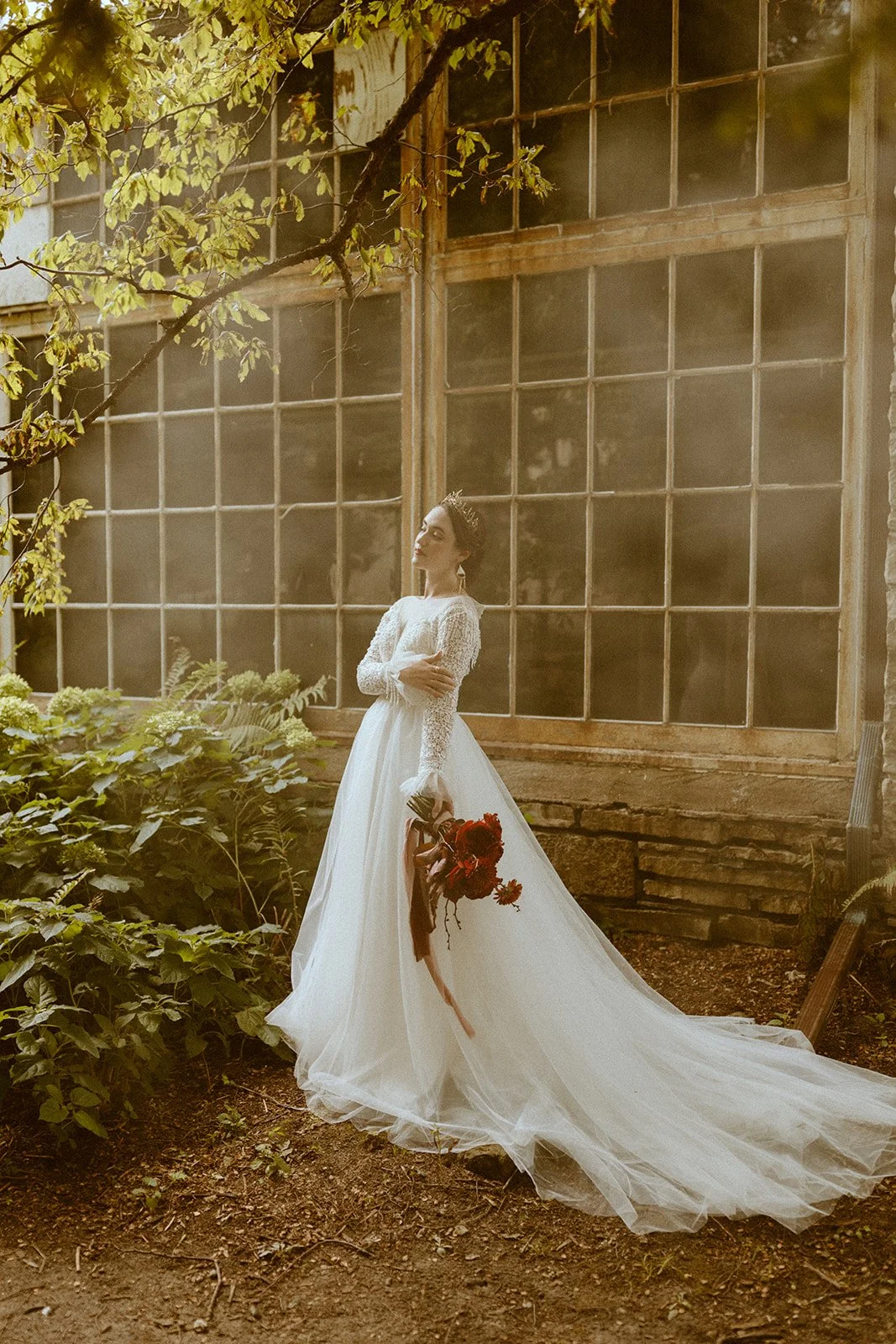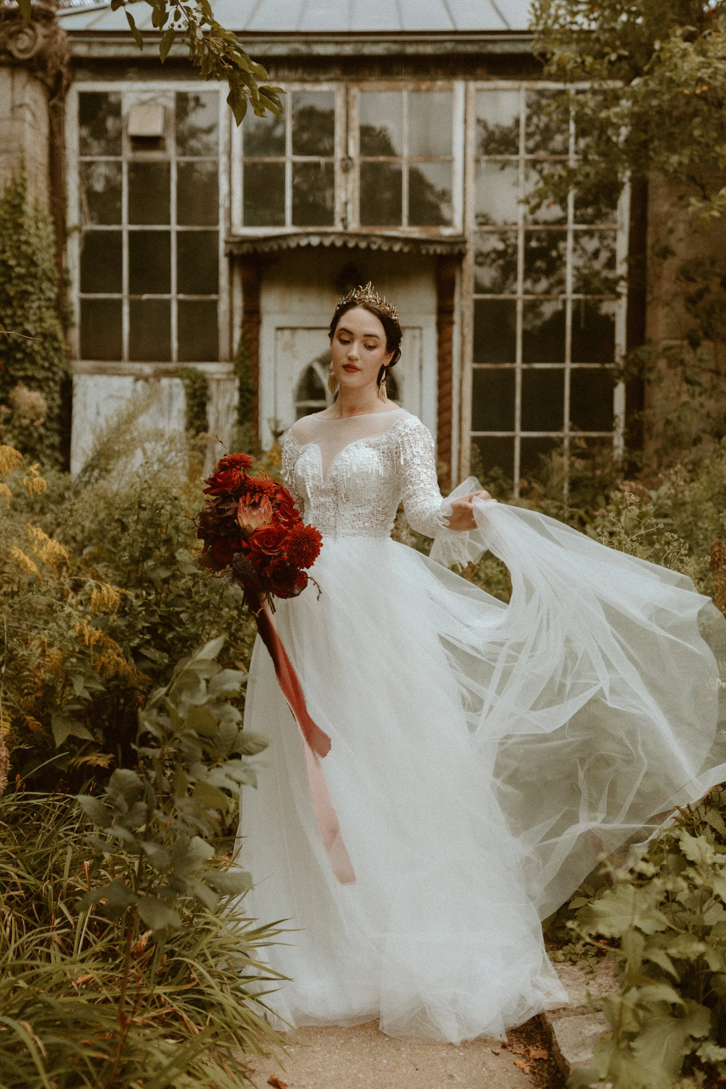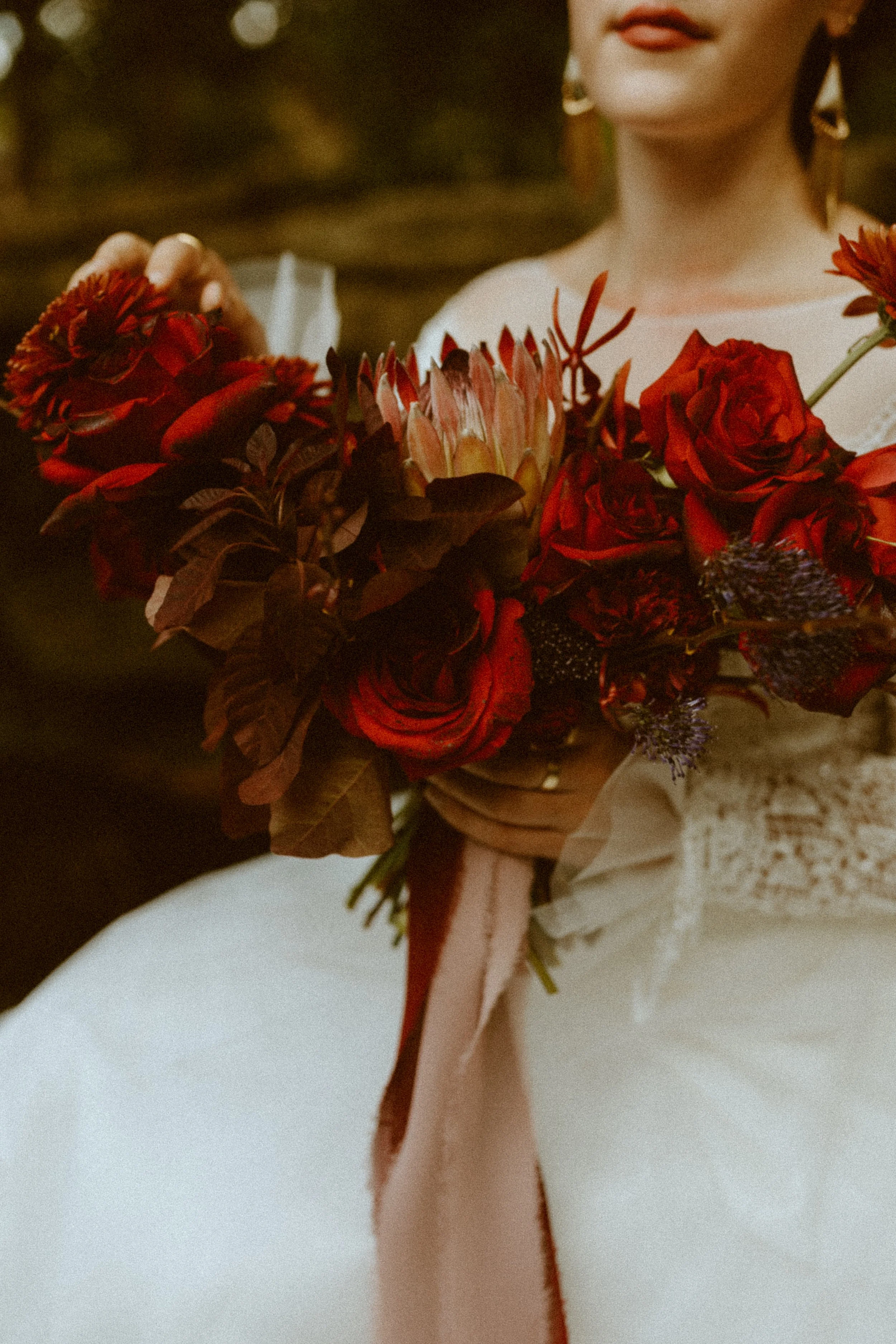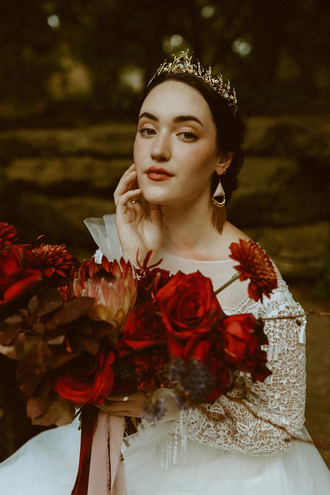 A woman wearing a crown and earrings, holding a bouquet of red and brown flowers, dressed in a white lace dress, standing outdoors with a blurred natural background.