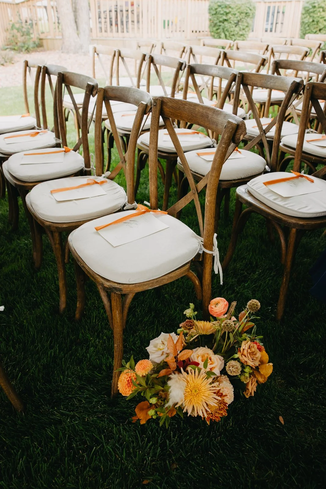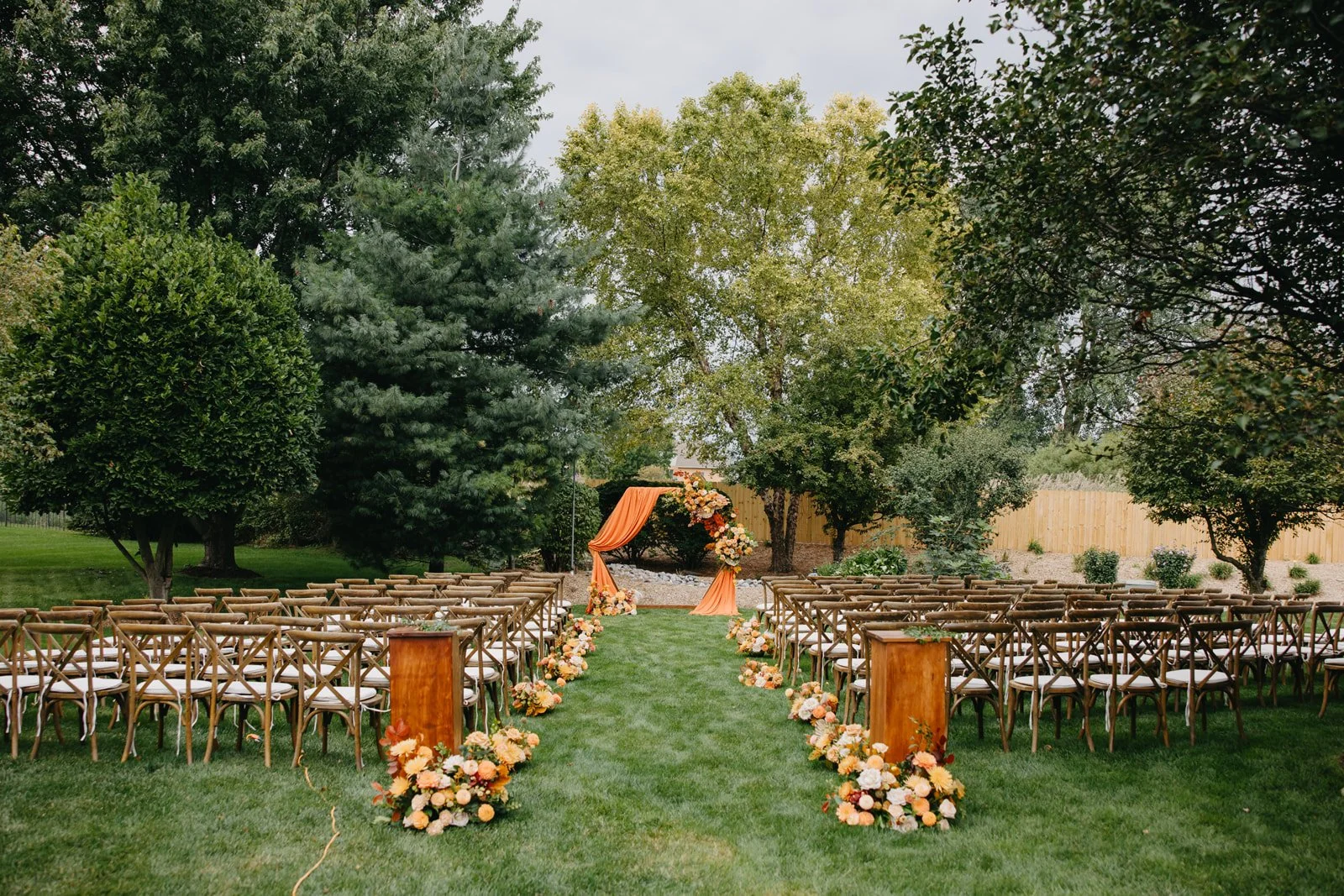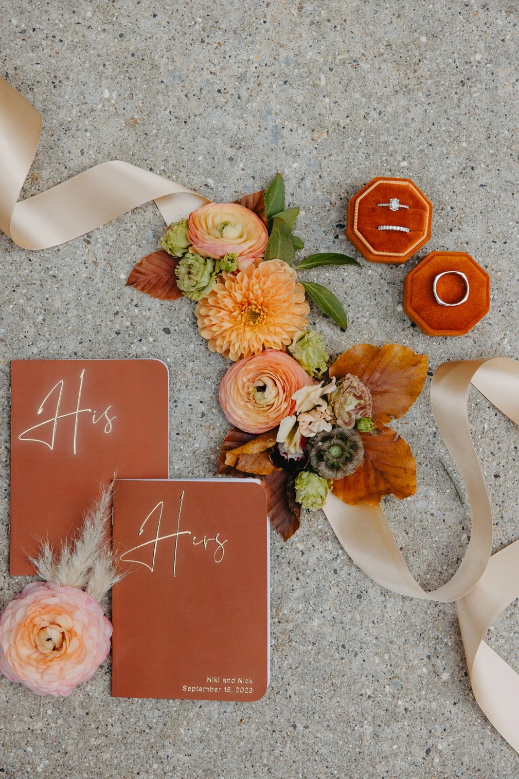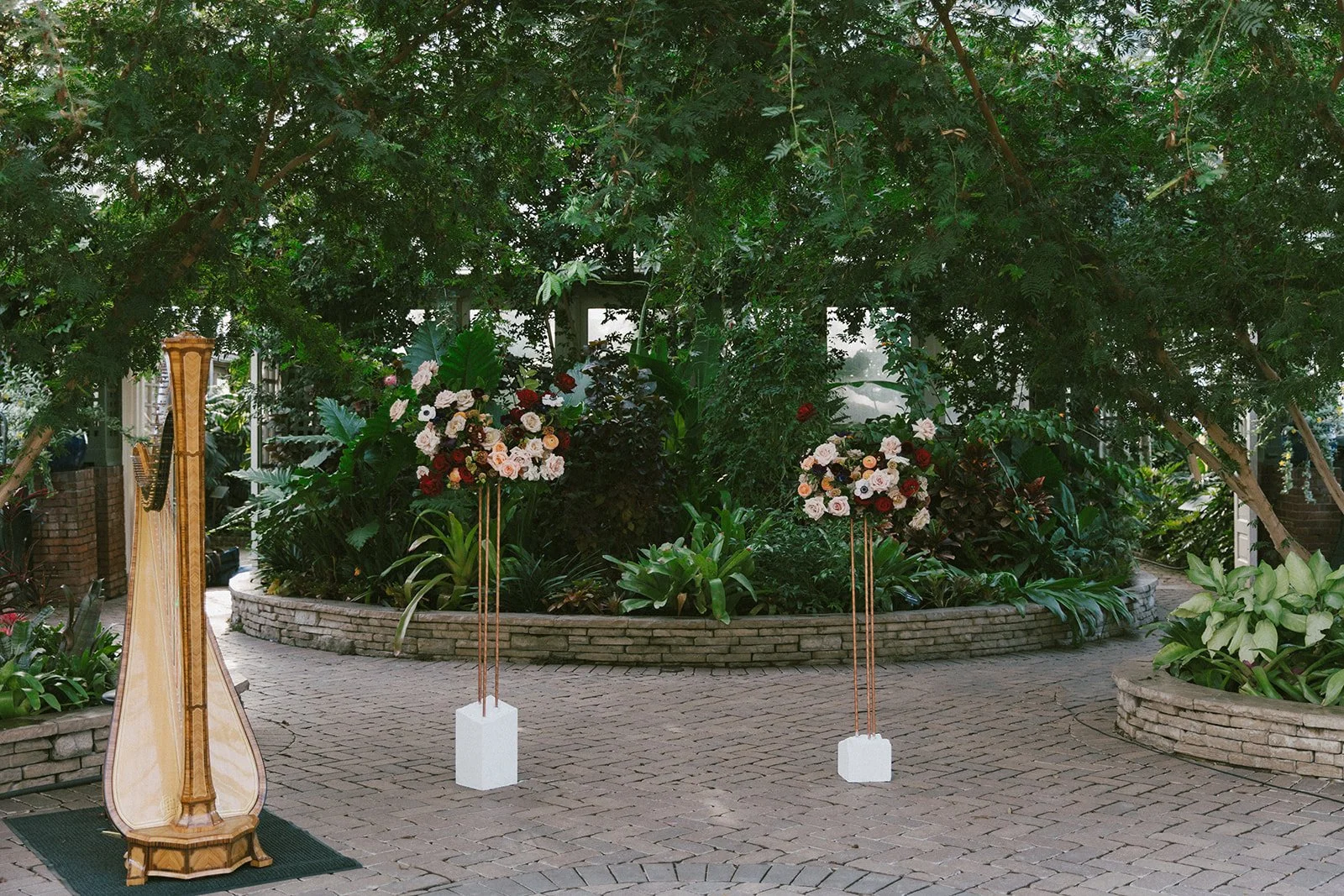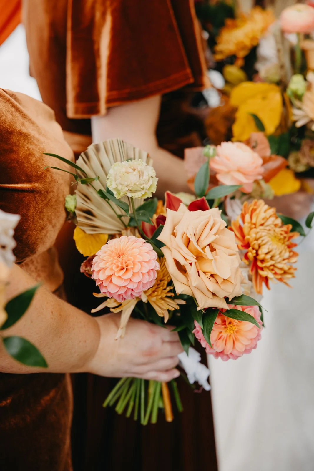 A bride and groom look at each other during their wedding ceremony, with the bride holding a bouquet of pink, peach, and cream flowers, and the groom wearing a rust-colored suit with a matching tie, under a floral canopy.