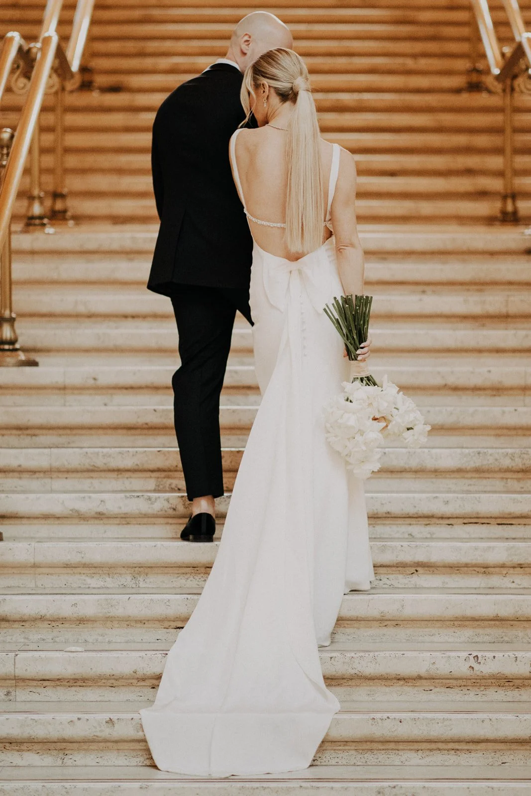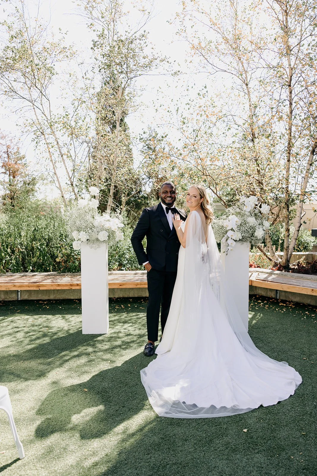 Bride and groom on their wedding day in an intimate embrace, with the bride holding a bouquet of white flowers, both wearing wedding attire, outdoors on a rooftop or terrace.