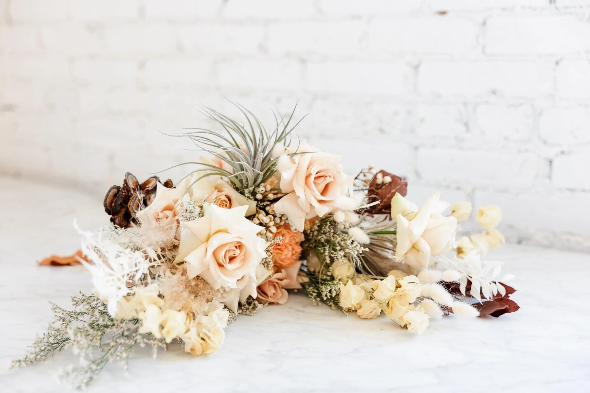 A bouquet of pastel-colored flowers including pink, white, cream, and apricot blooms resting on a white textured surface.