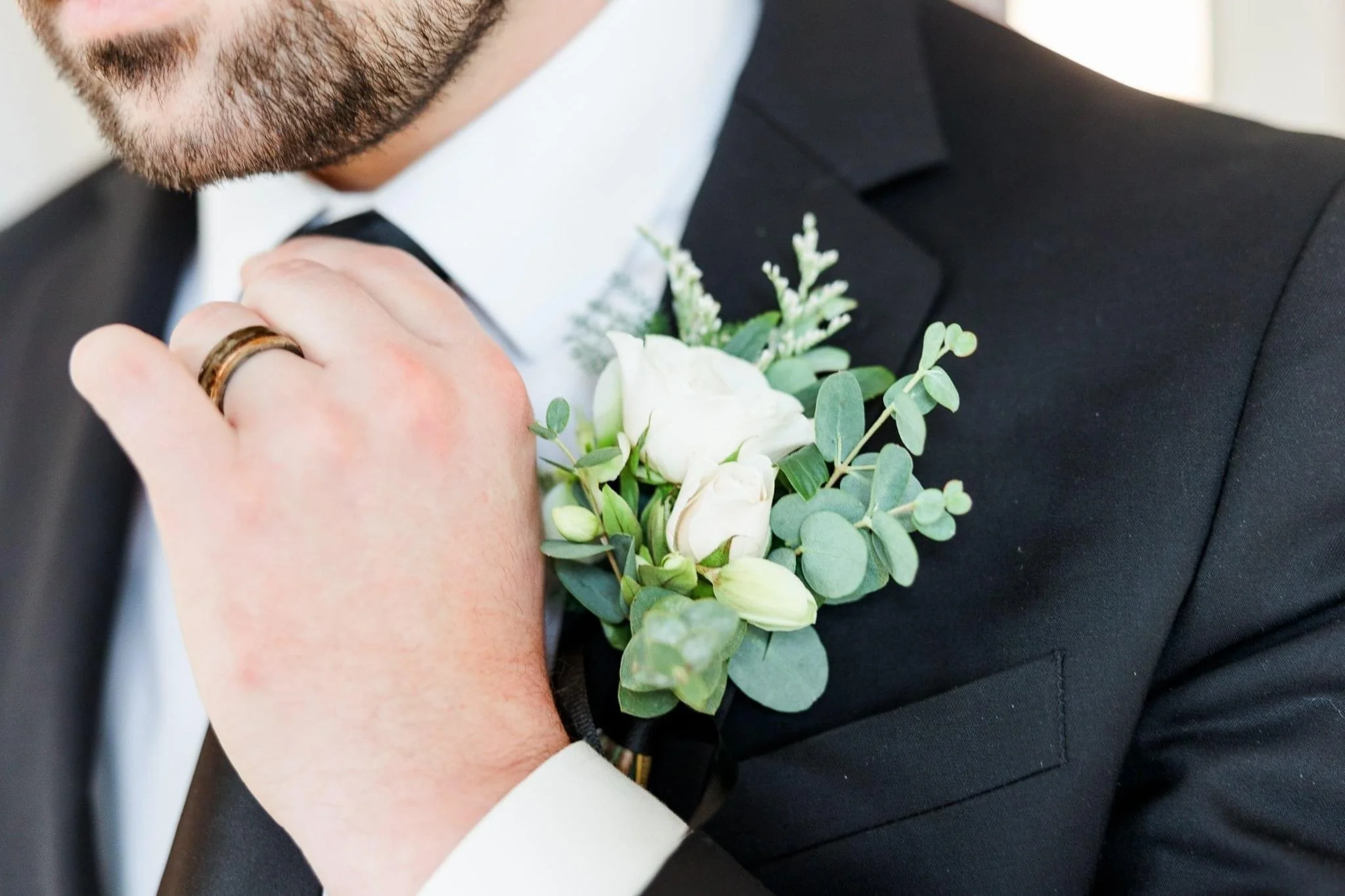Close-up of a man in a gray suit with a pink tie and a colorful boutonniere on his lapel, adjusting his jacket with his hand.
