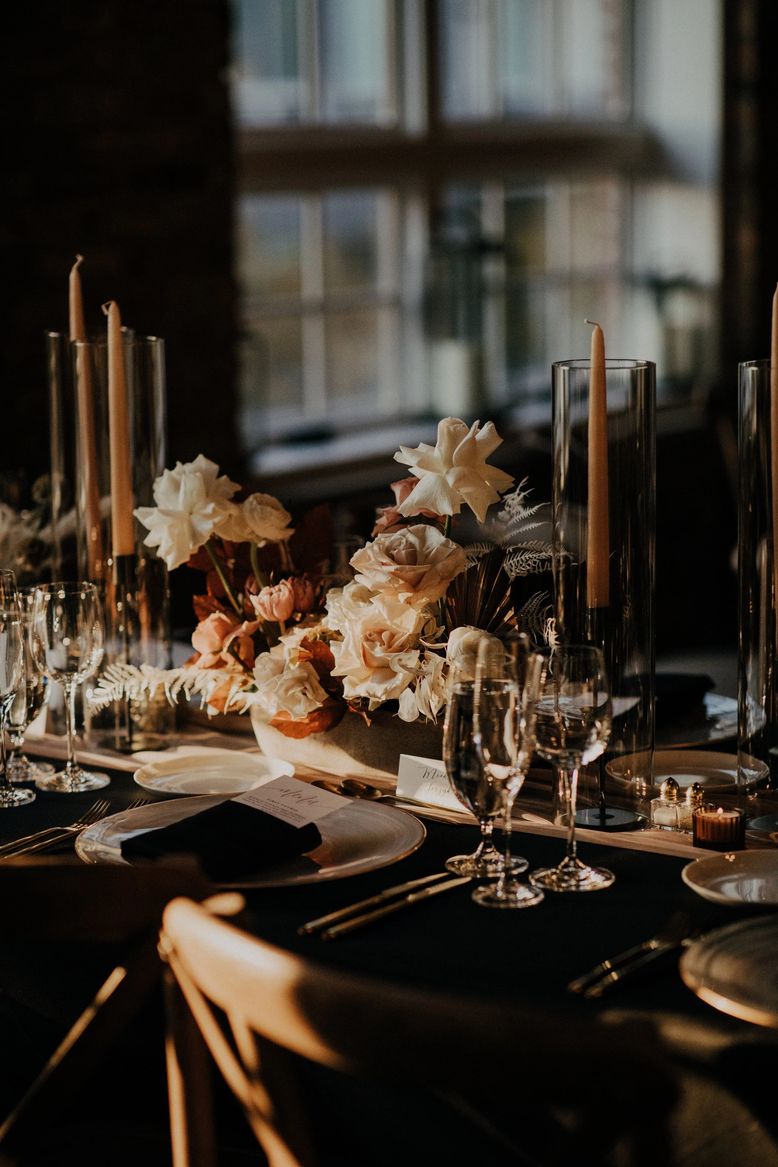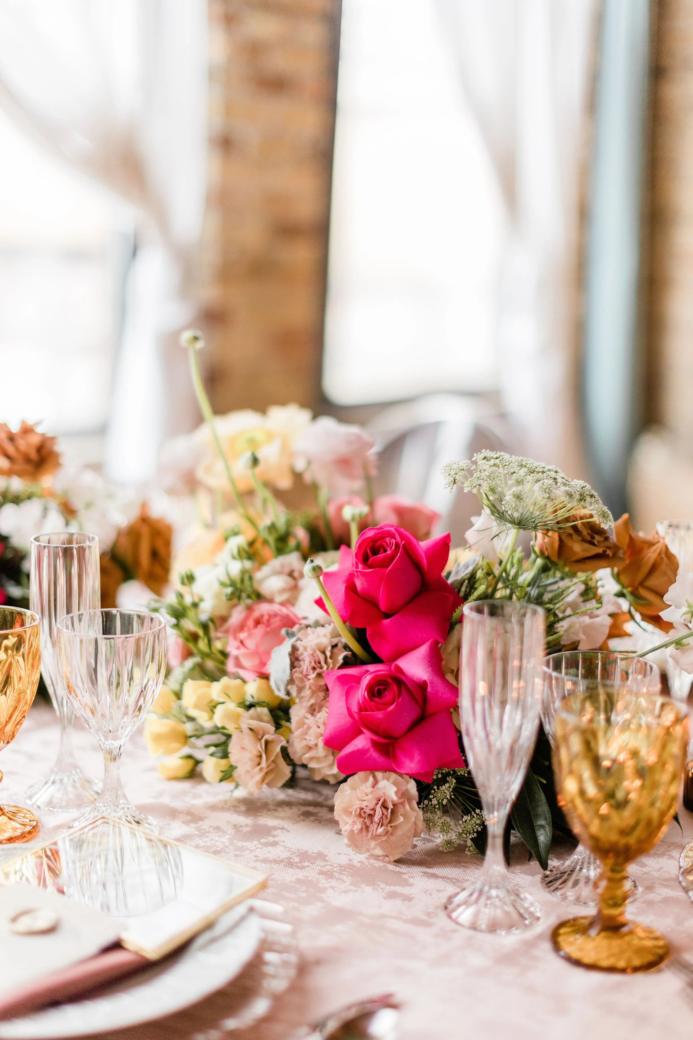 A floral centerpiece with pink, cream, and peach flowers on a table with glassware and candles.