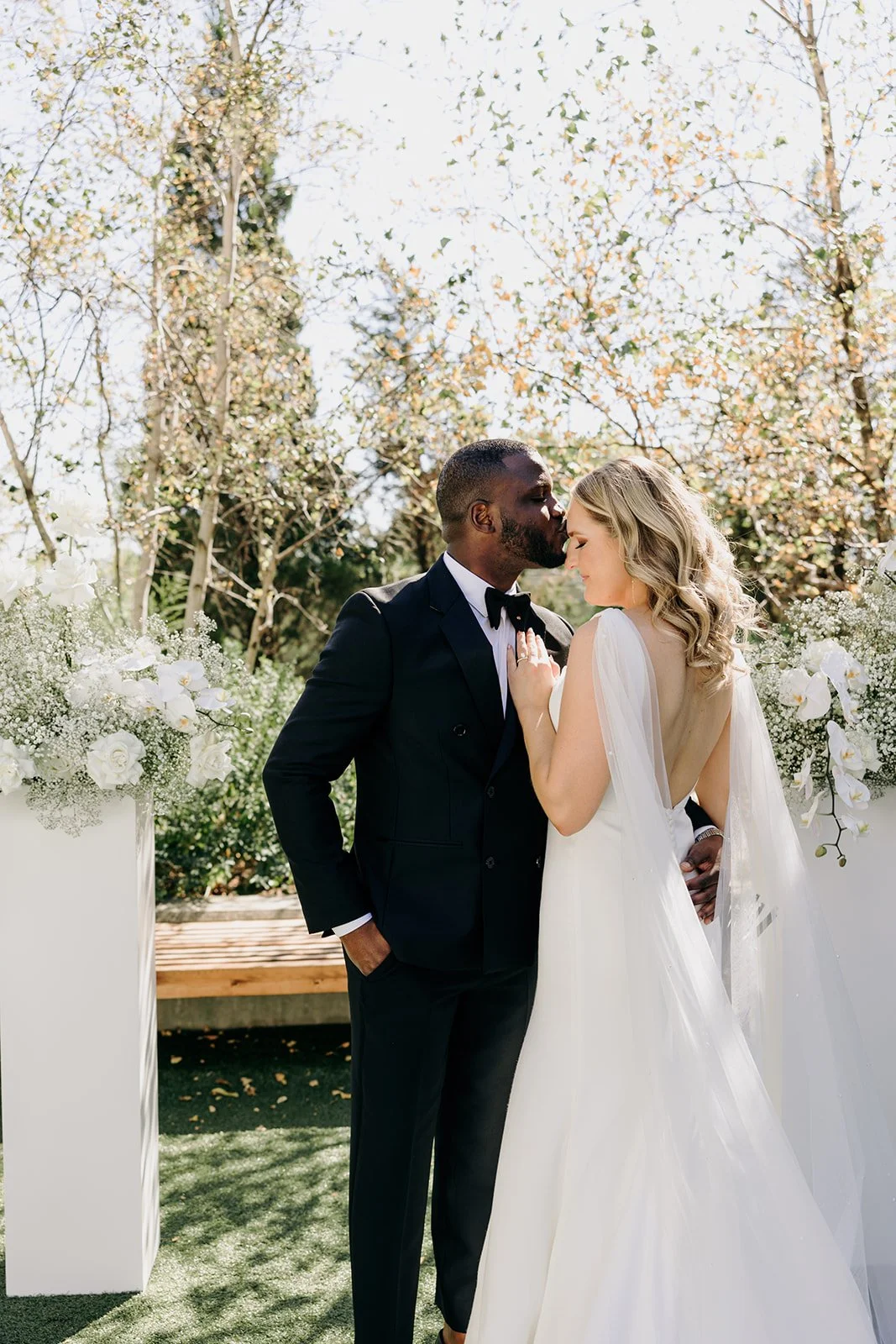 A bride and groom sharing a kiss during their wedding ceremony, the bride holding a large bouquet of pink, yellow, and white flowers. The bride is wearing a white lace wedding dress with sheer, embroidered sleeves, and the groom is dressed in a dark