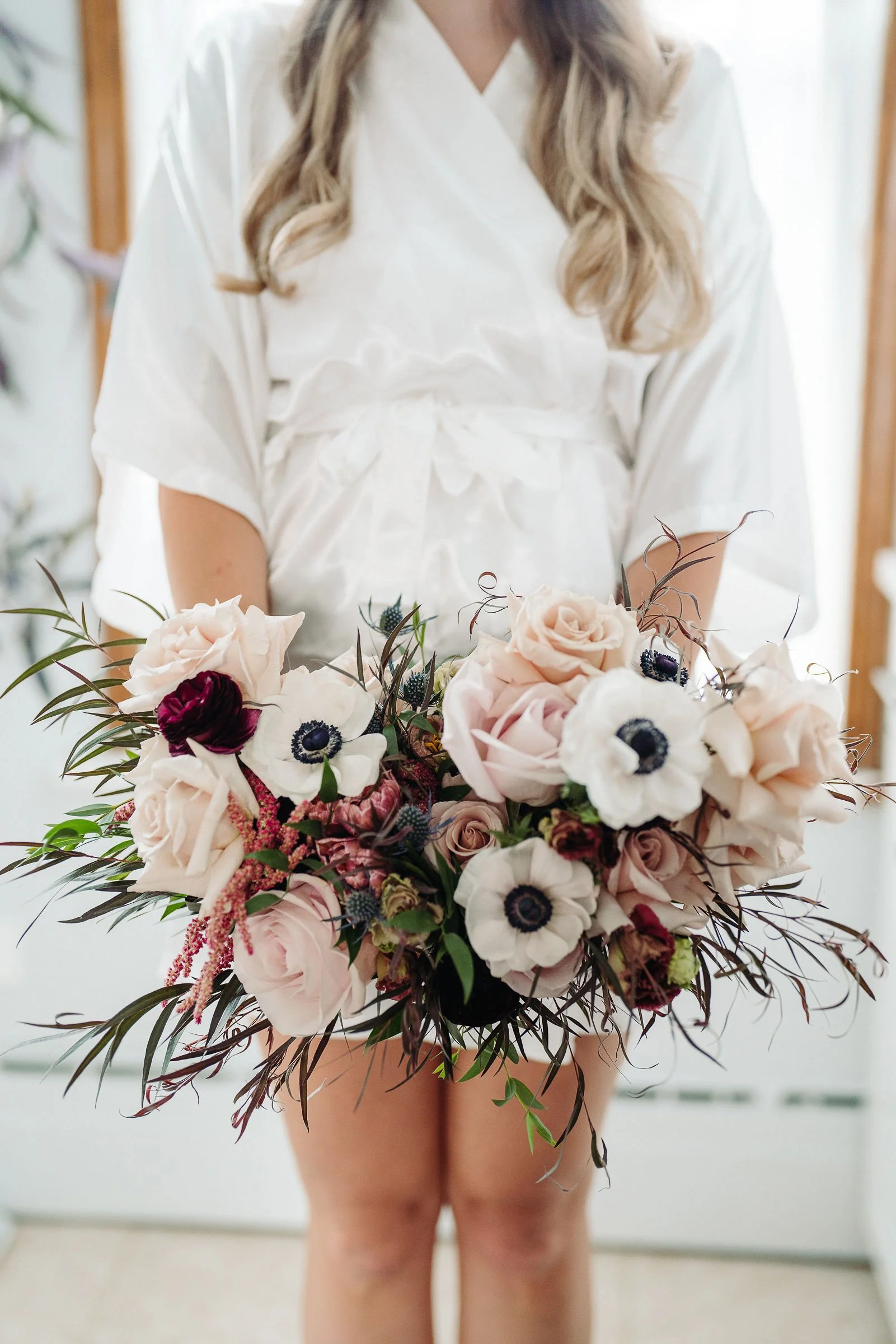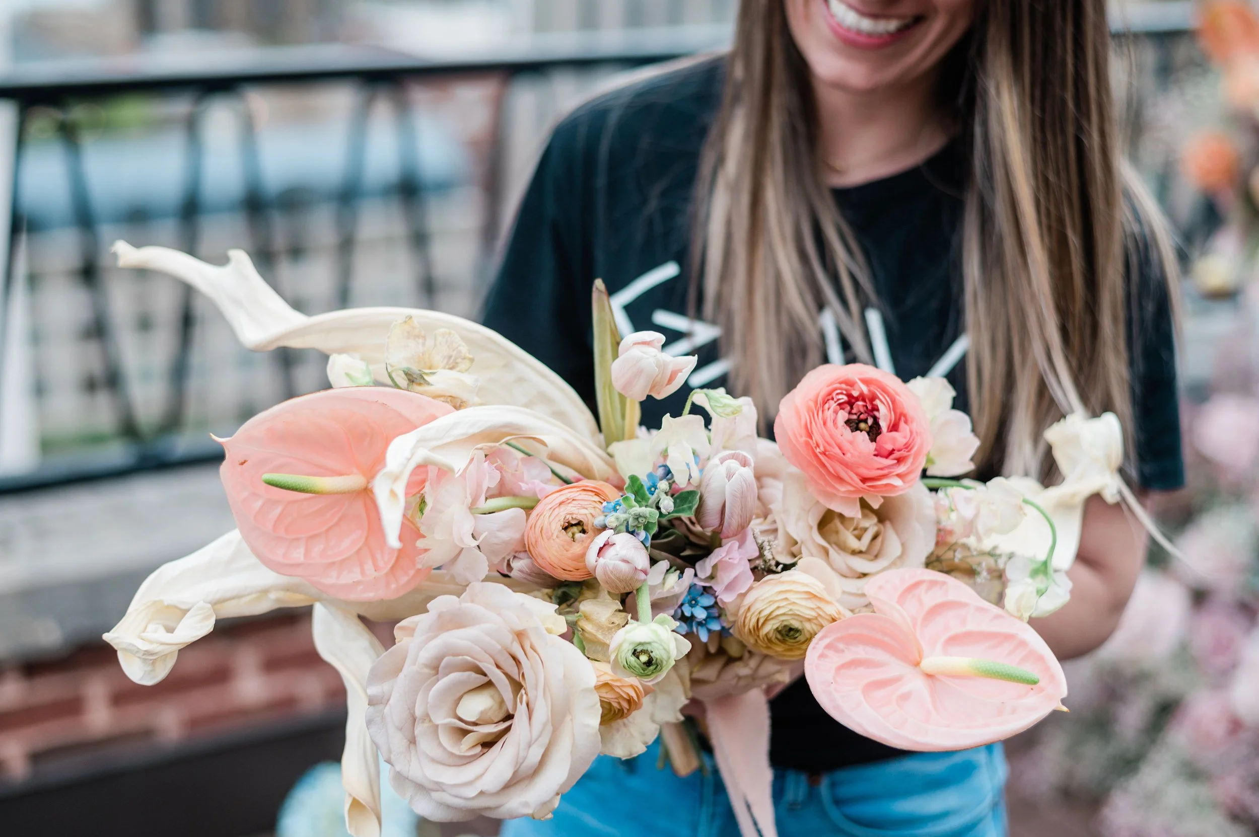 Person in a wedding dress holding a bouquet of pastel pink, yellow, and white flowers including ranunculus and poppies.