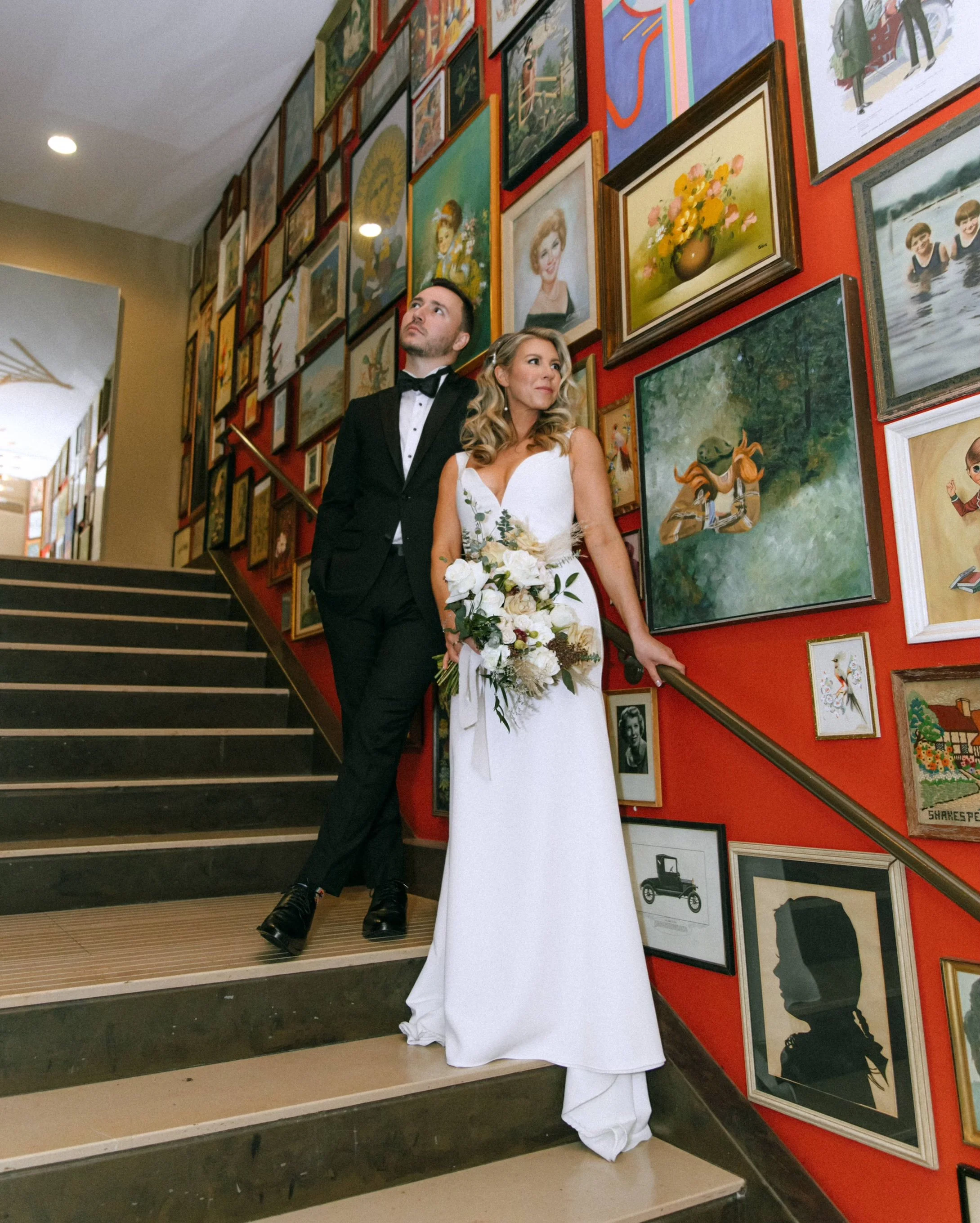 A bride in a white wedding gown holding a bouquet standing on stairs with a groom in a black tuxedo, inside an art gallery with a red wall covered in colorful framed paintings.