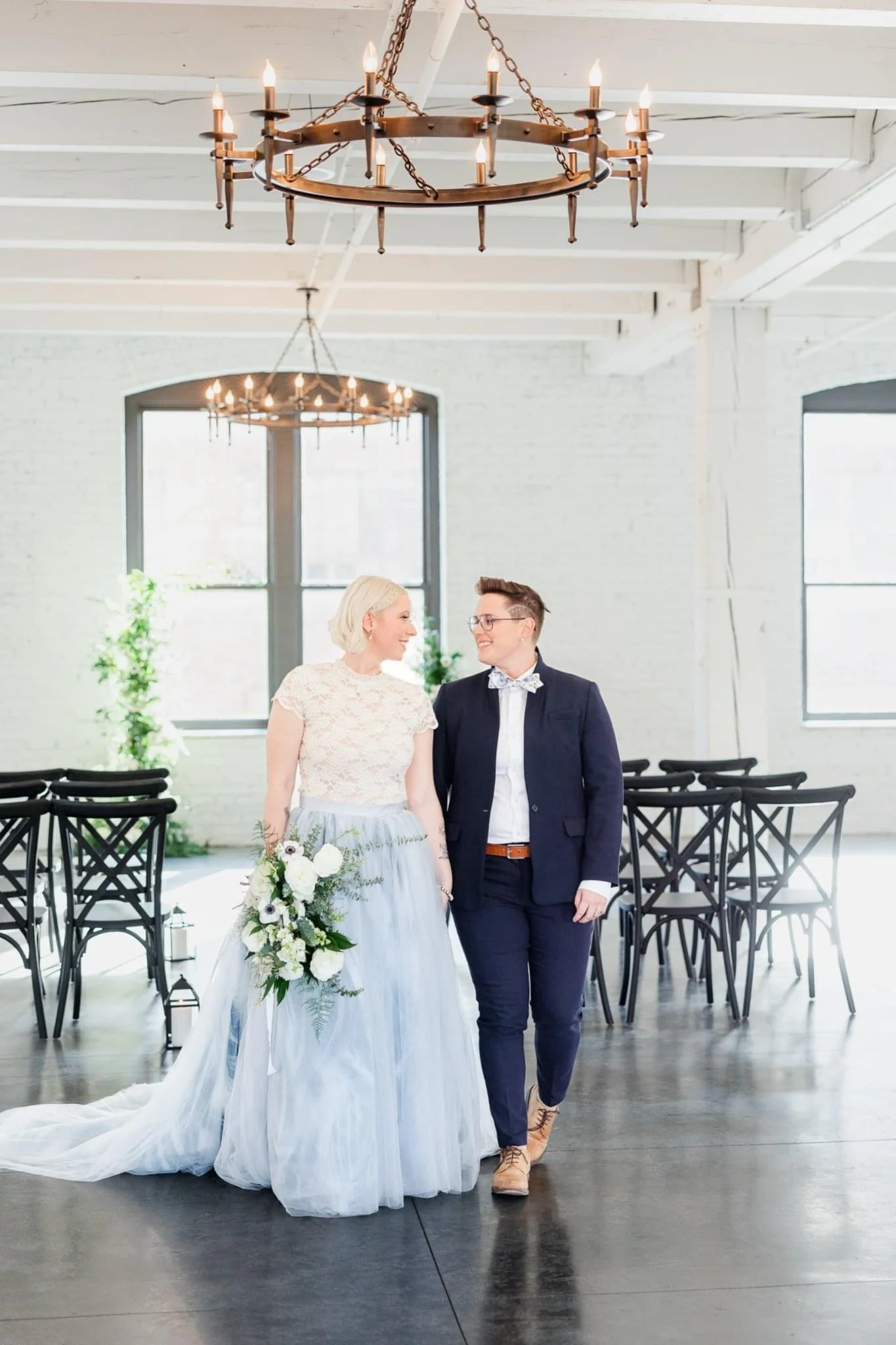A bride and groom holding hands in a restaurant with a wall of keychains behind them.