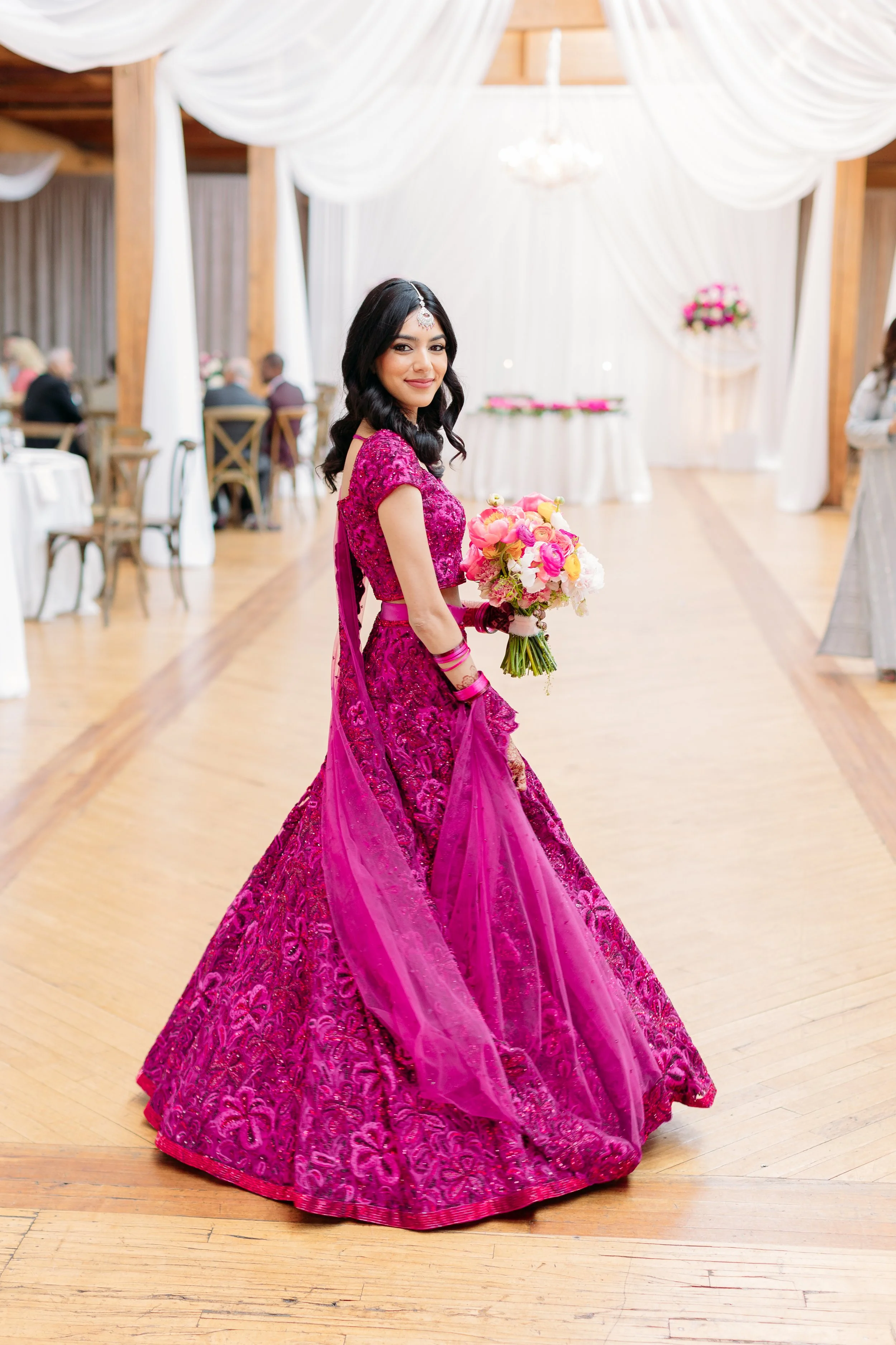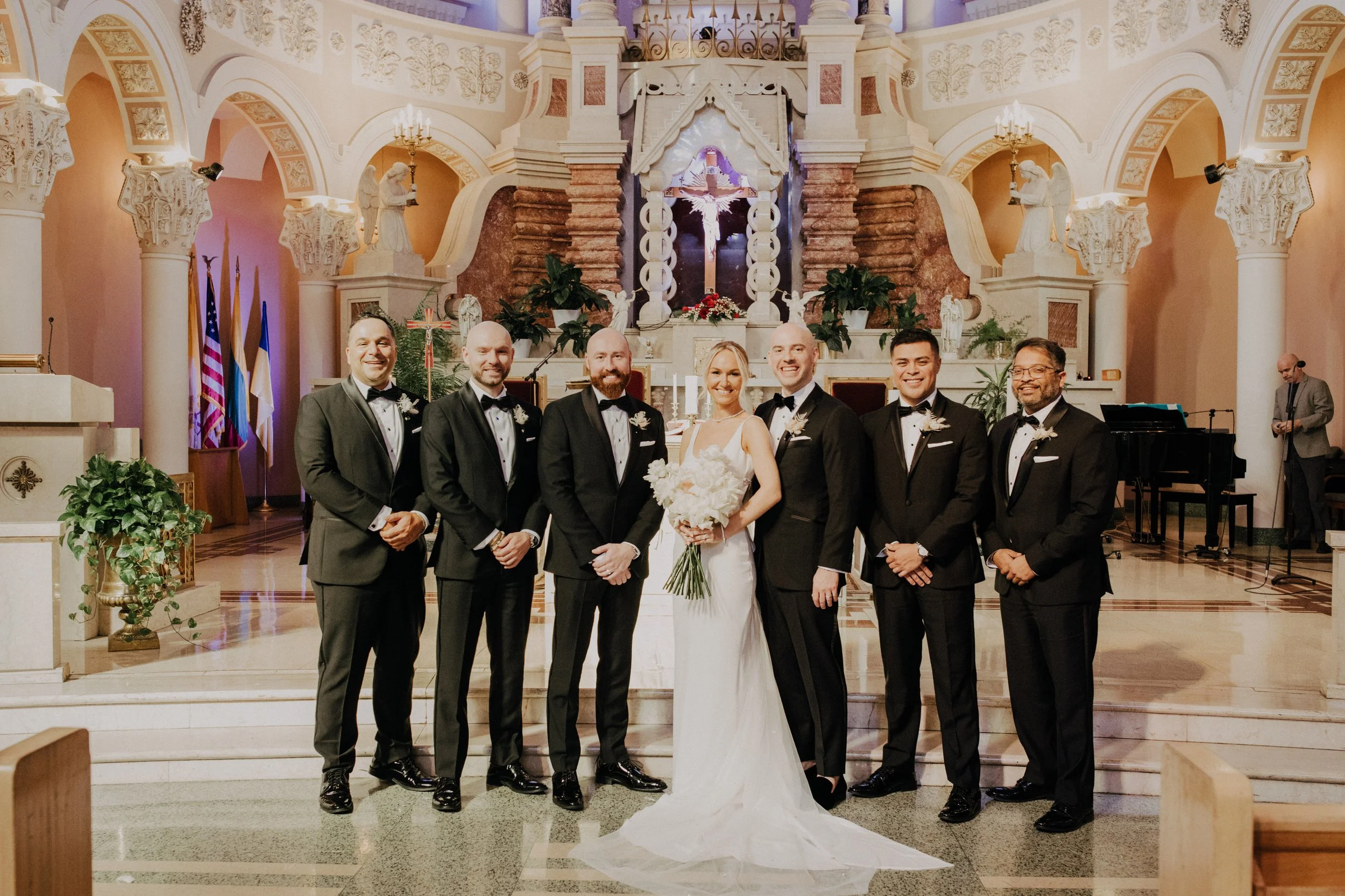 A bride in an off-the-shoulder white wedding dress holding a bouquet of white roses and orchids on a rooftop with decorated floral archway.