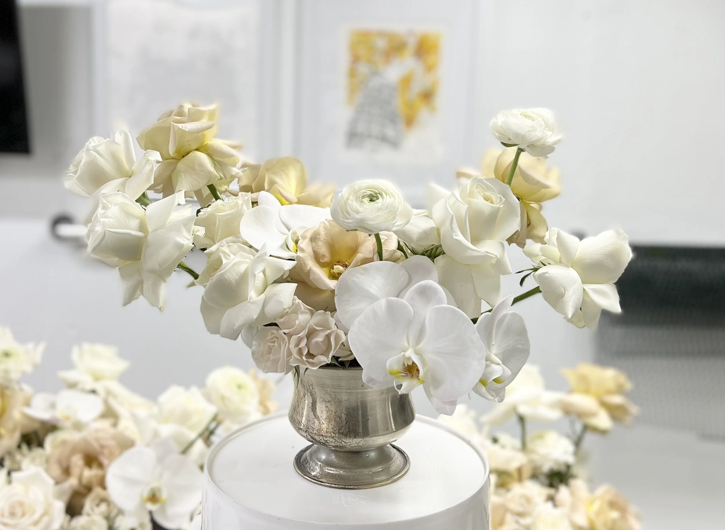 Elegant floral arrangement with white flowers and dark green leaves on a copper stand near a large window with city buildings in the background.