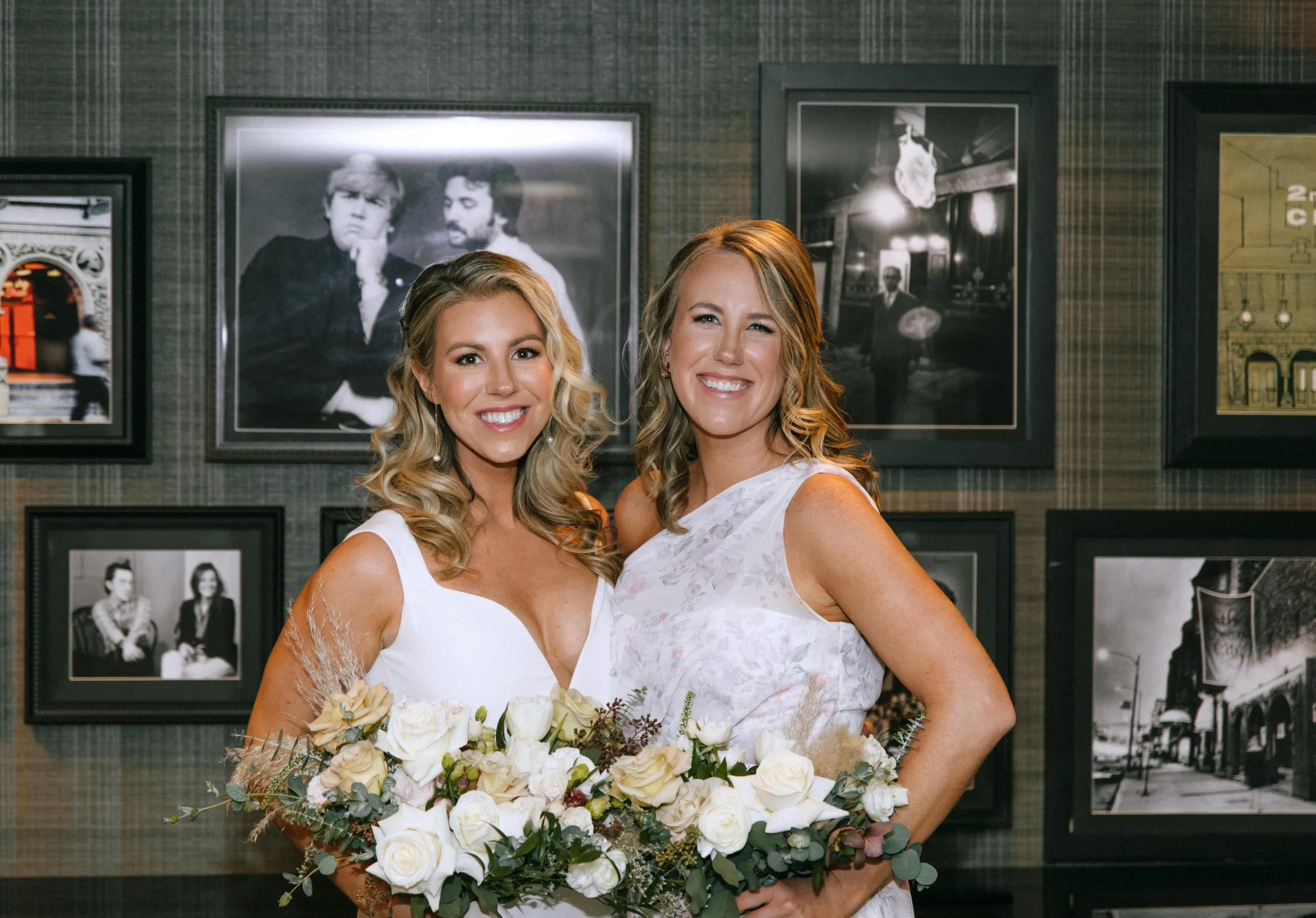 Two women with blonde hair smiling, holding a bouquet of white and cream roses, standing in front of a wall with framed black-and-white photographs.