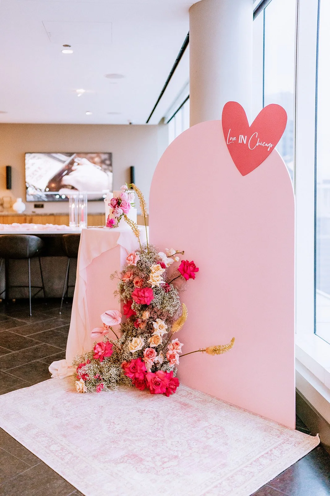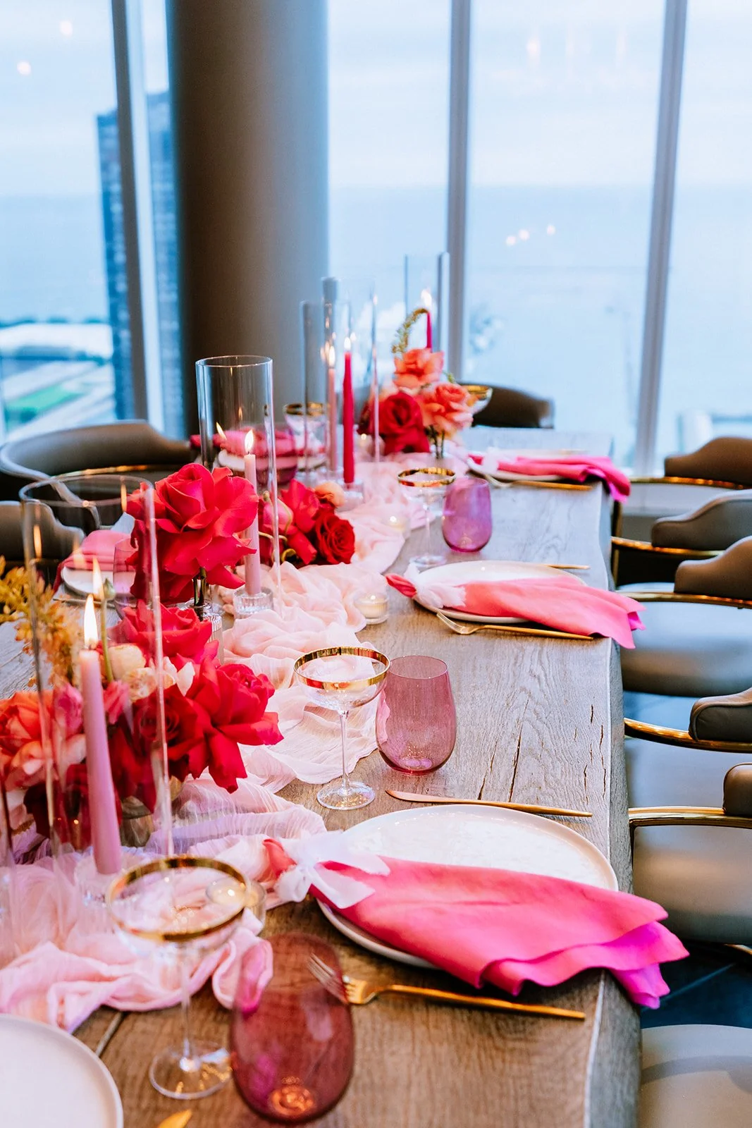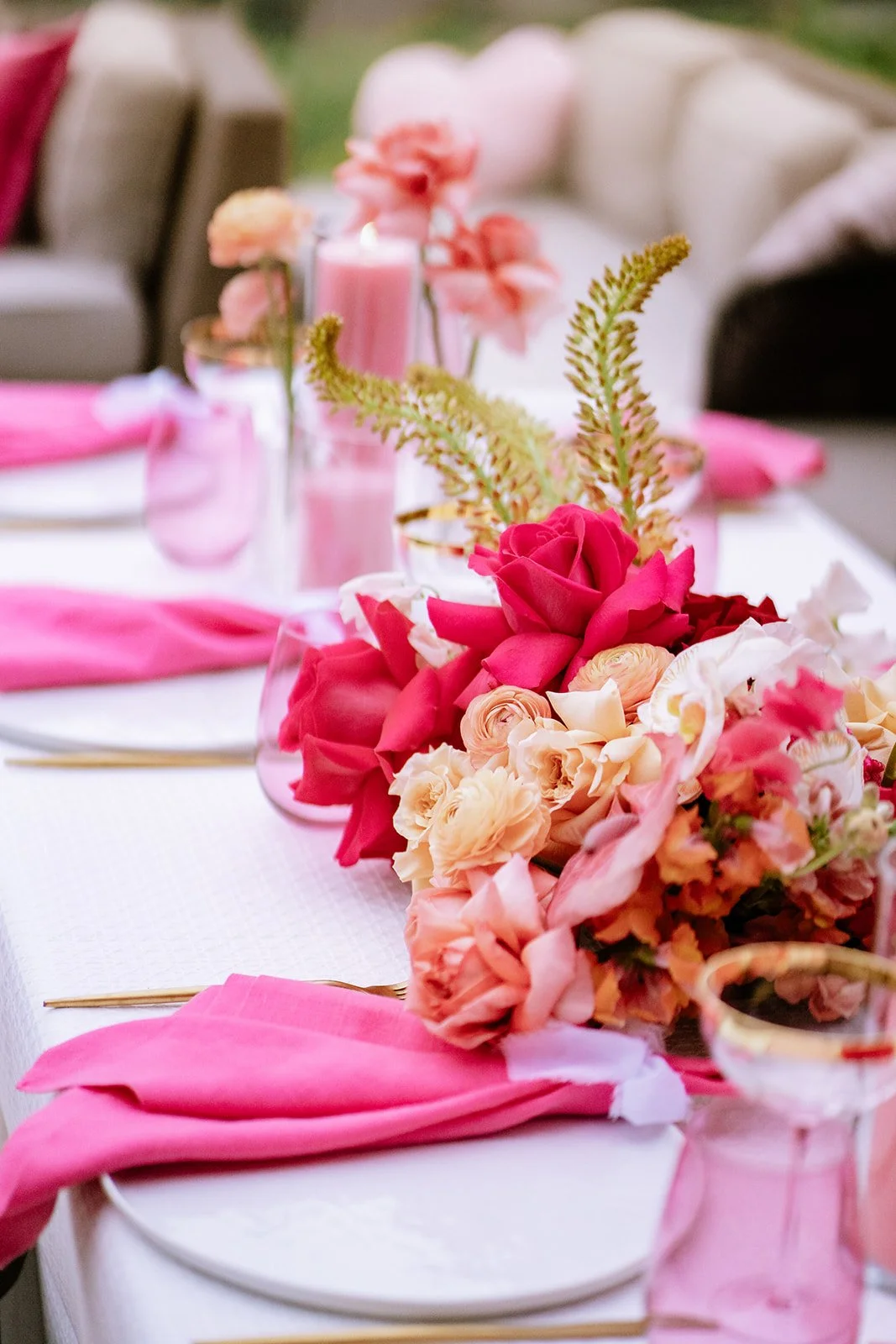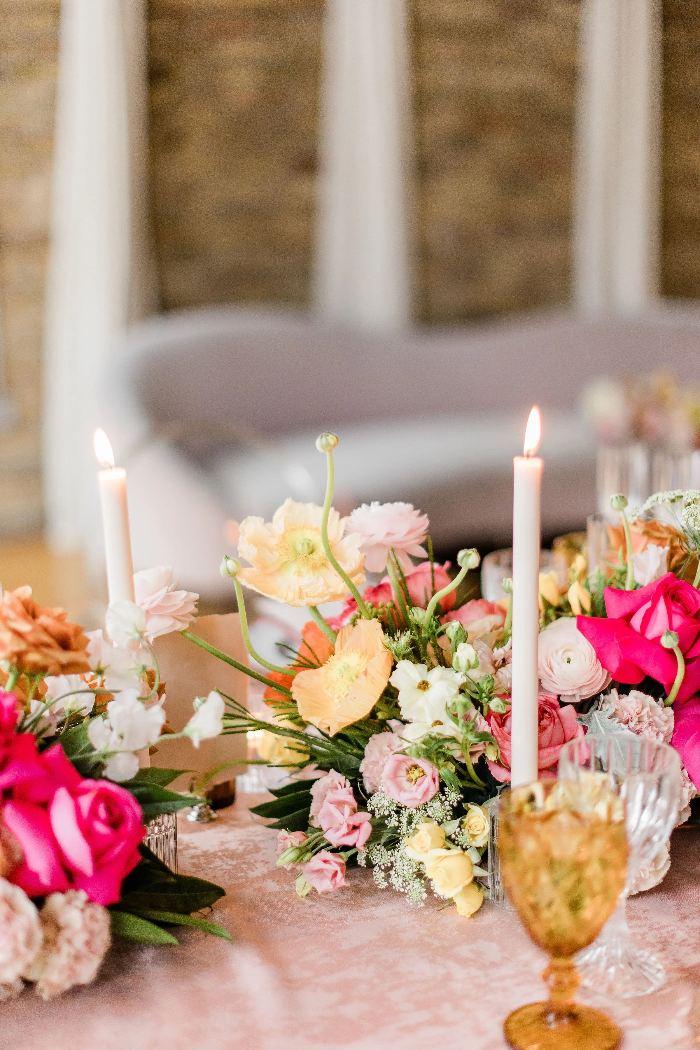 Floral centerpiece with pink, peach, and white flowers, candles, and glassware on a pink tablecloth at a decorated event.