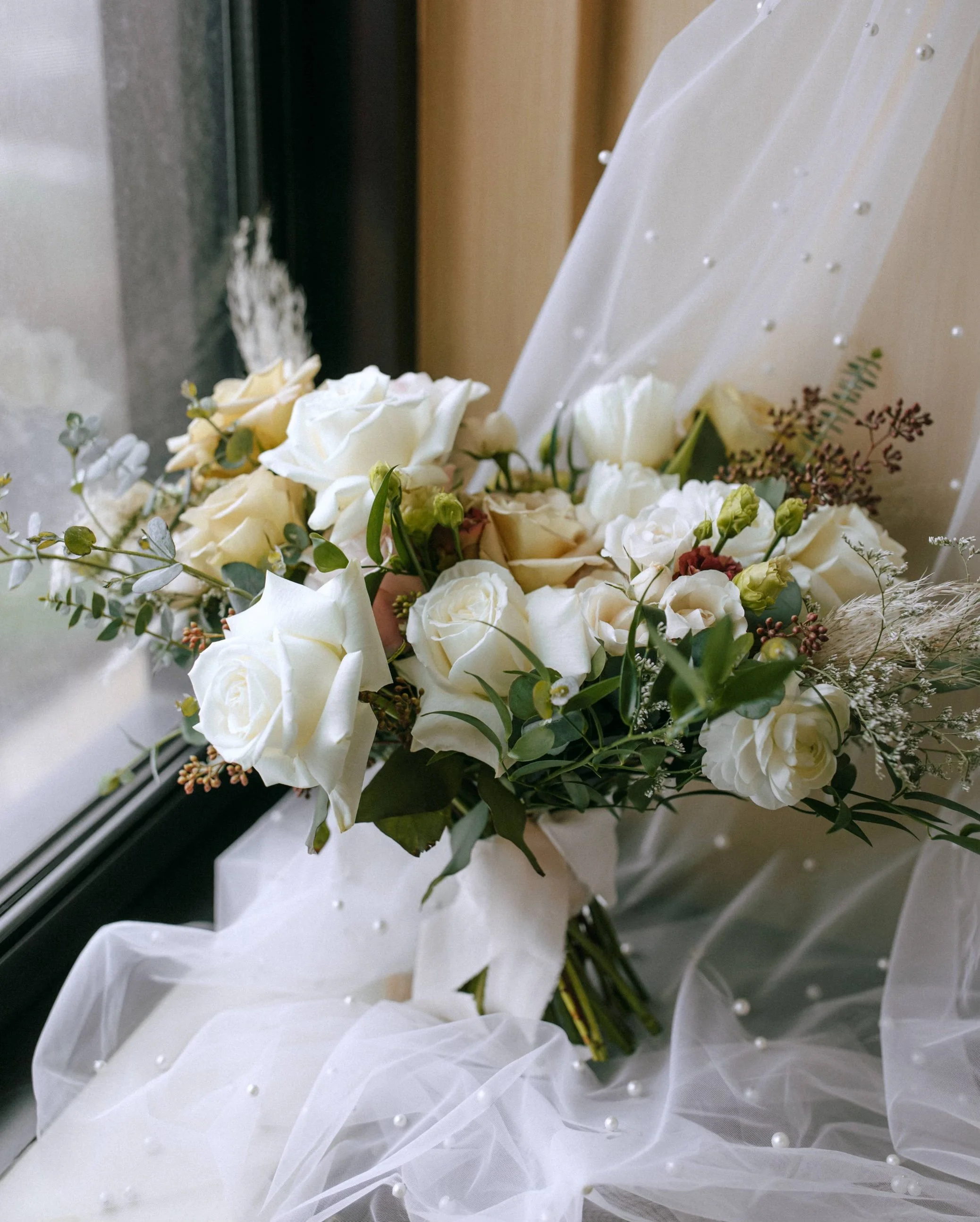 A bouquet of white roses, greenery, and small filler flowers resting on sheer white fabric with pearl accents near a window.