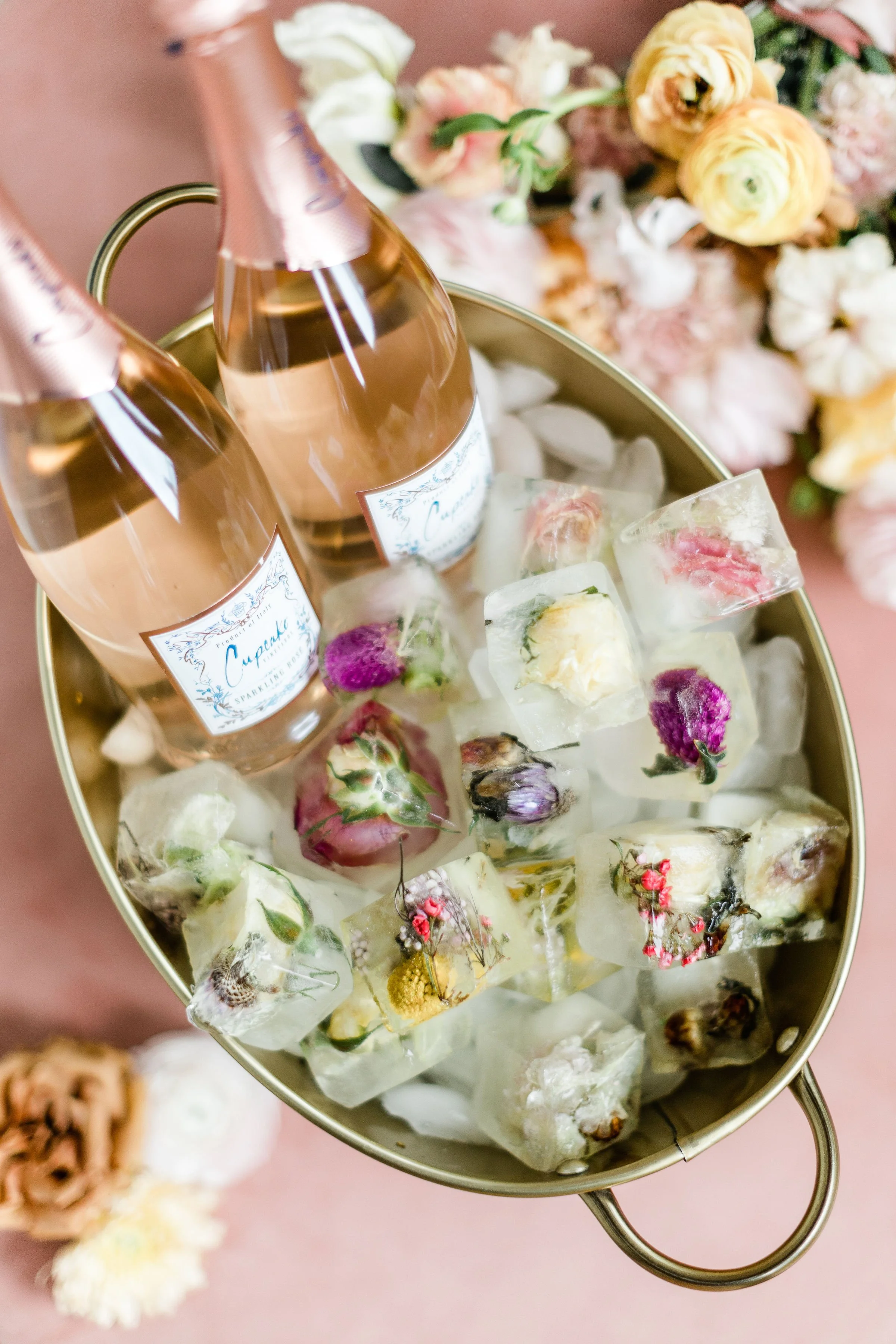 Two bottles of rosé sparkling wine on ice in a bowl filled with ice cubes that contain colorful embedded flowers and small objects. There are pink, white, and yellow flowers in the background.