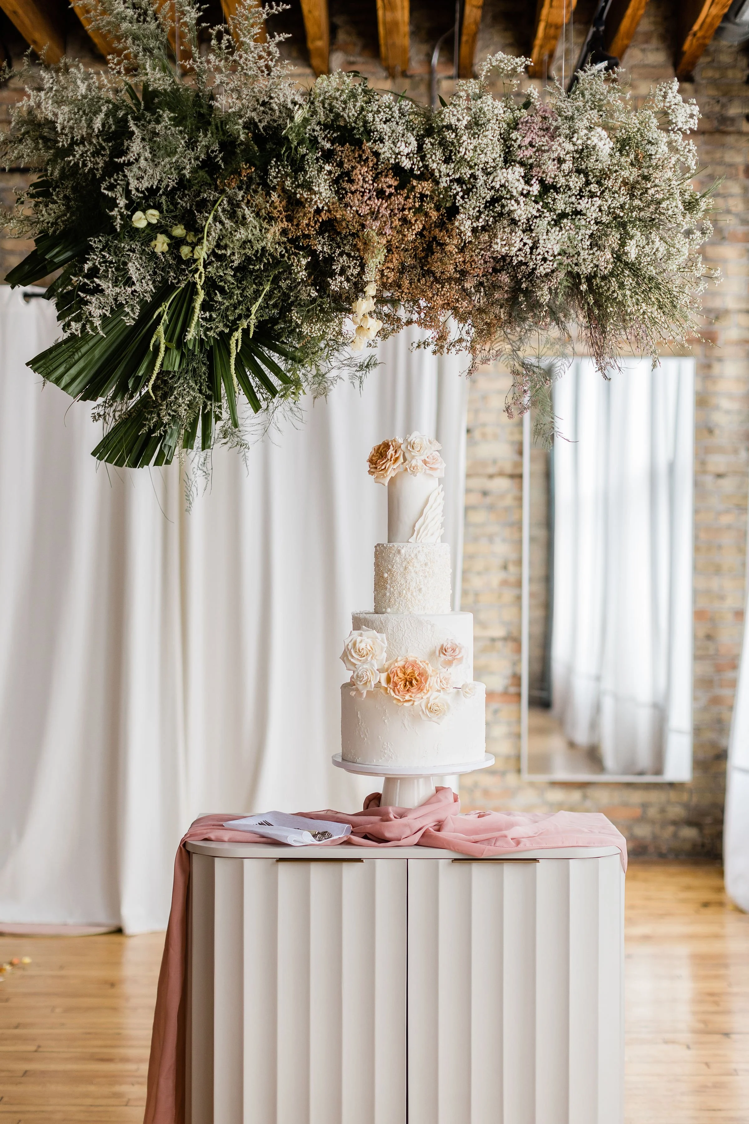 Elegant wedding cake with four tiers decorated with roses and textured icing, placed on a cream-colored cabinet with a pink cloth, above a large floral arrangement of white and pastel flowers hanging from the ceiling.