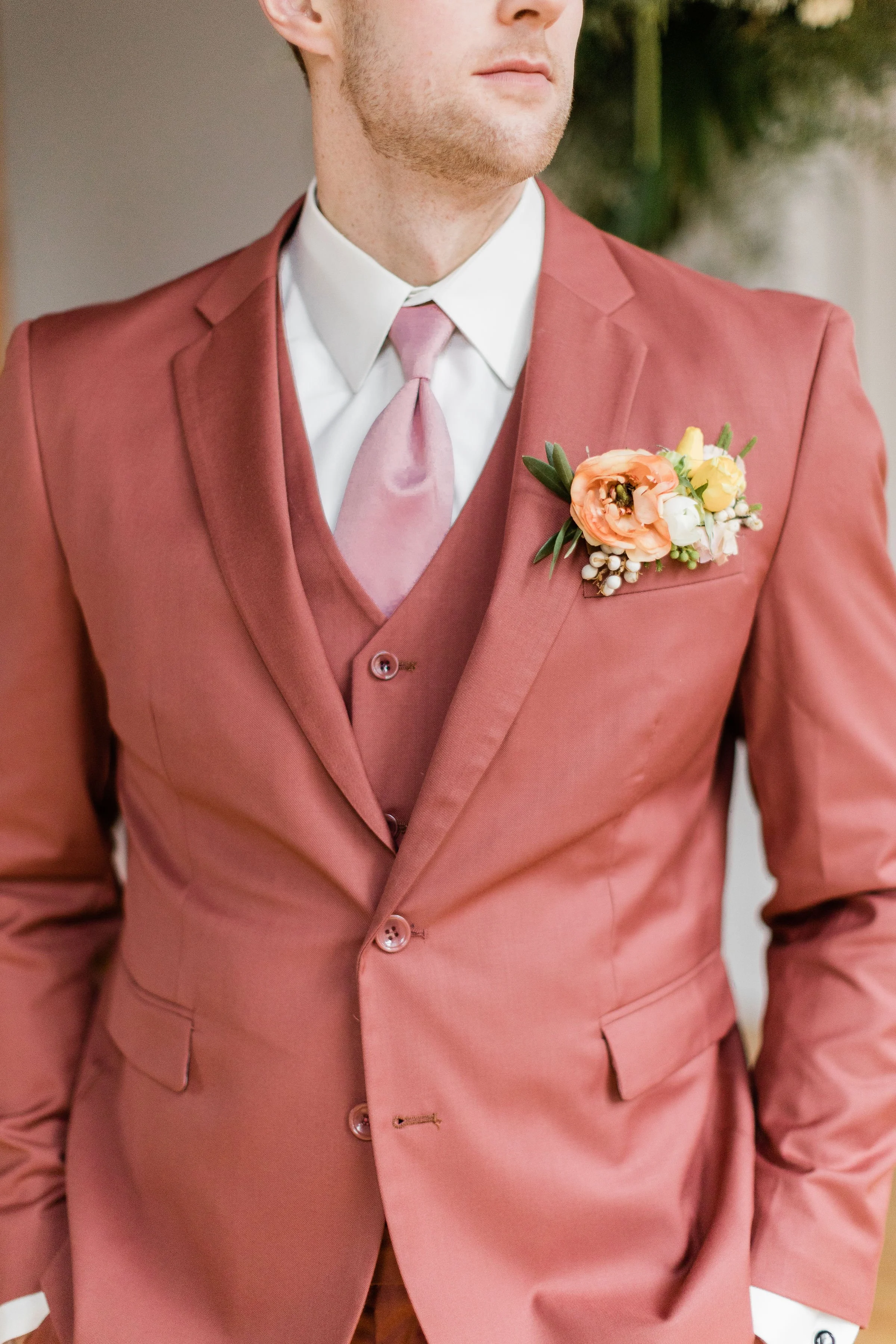 Close-up of a man in a salmon-colored suit with a pink tie, white shirt, and a boutonniere of peach and white flowers on his lapel.