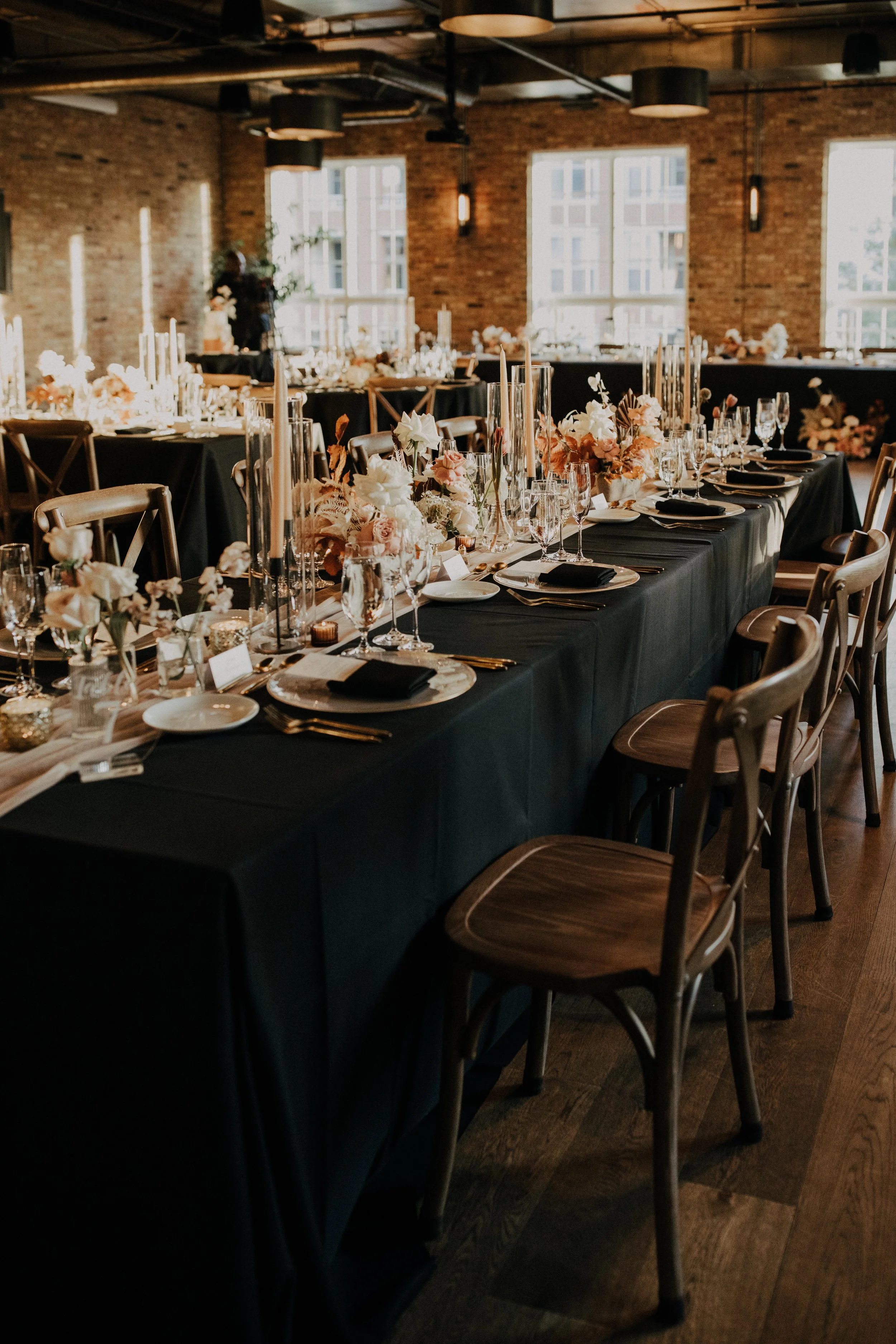 Elegant indoor dining table with pink tablecloth, white floral arrangements, and black chairs.